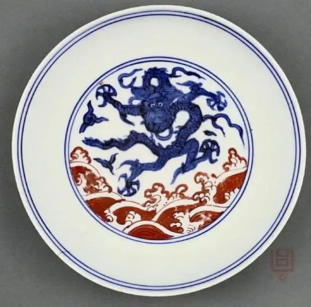 博物馆收藏明嘉靖青花矾红盘文物(回青)