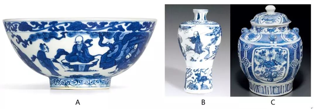 万历早期用的回青料呈色好,蓝中带紫(A),晚期由于配比回青料用得少颜色明显灰暗(B、C)。