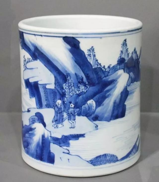 经过挑选珠明料后再加入其他材料,使其氧化钴的比例提高,这样其中的铁、锰比例相应减低了,青花的发色就显得明丽、纯正、青翠明亮。这种青料如同中国水墨画,层次分明,表现阴阳向背,因此有了康熙青花"墨分五色"、"五彩青花"之称。