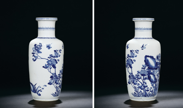 此件清光绪·青花瑞兽纹棒槌瓶,款识:康熙年制,盘口束颈,折肩圆筒腹,底承圈足。通身施白釉,釉面光洁细腻,腹部满绘瑞兽图案,有象、虎、麒麟等等,形象生动有趣,栩栩如生。口沿颈部绘回纹和珠帘纹等装饰,画工生动细腻,属陈设佳器。