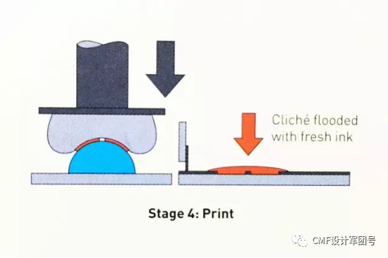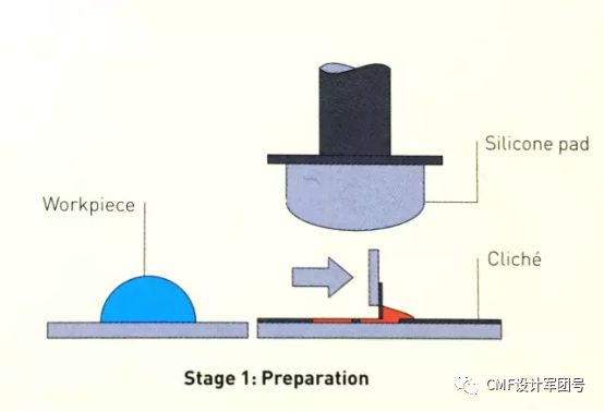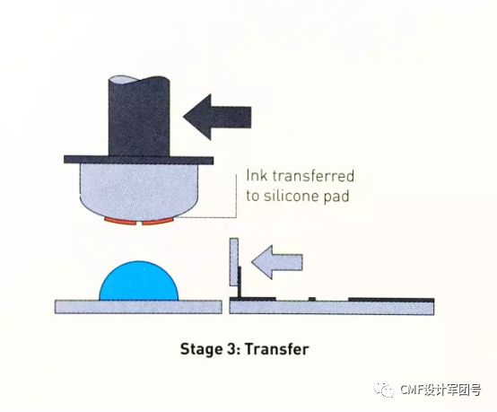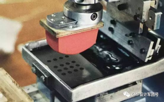 移印是把所需印刷的图案先用胶片蚀刻的方式制成钢板(或者铜、热塑型塑料)凹版,再利用硅橡胶材料制成的曲面移印头,将凹版上的油墨蘸到移印头的表面,然后往需要的对象表面压一下就能够印出文字、图案等。