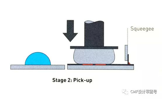 2. 硅胶头下降到钢版将图案内的油墨沾起。
