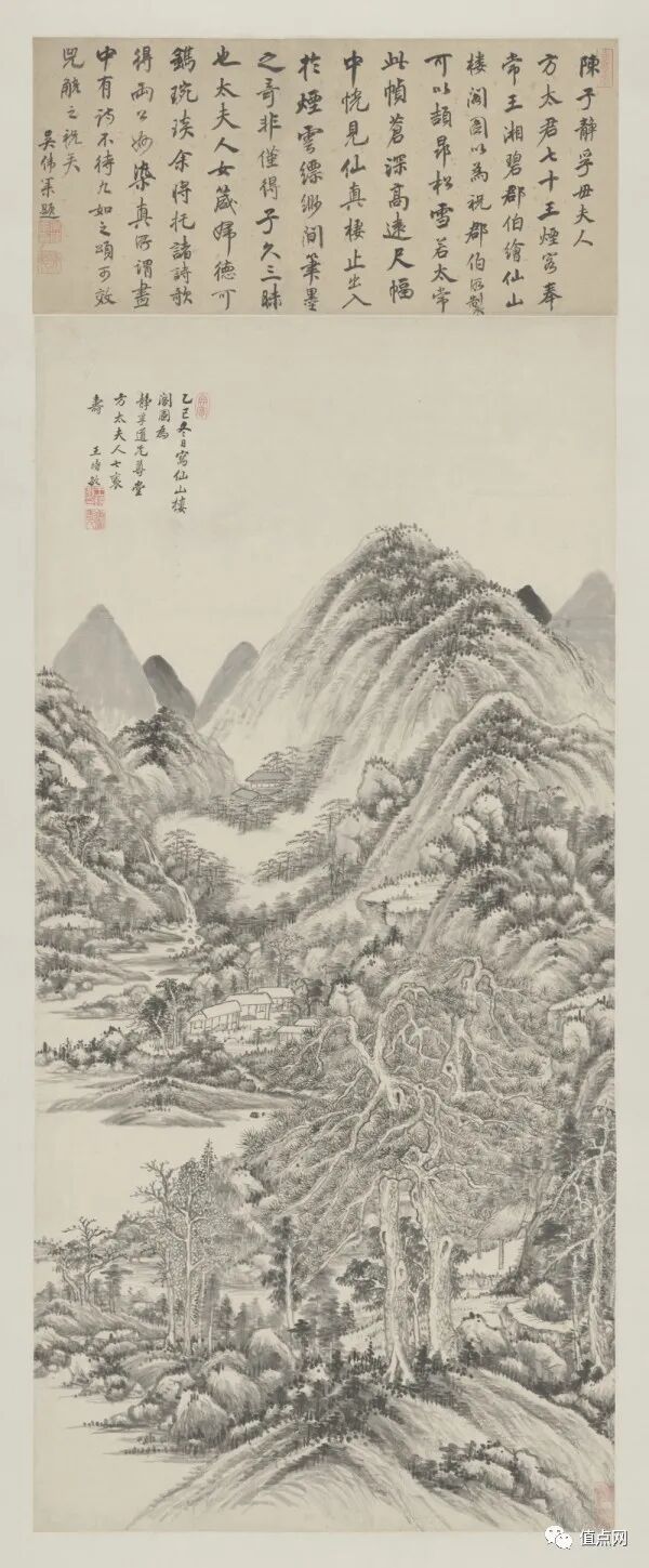 与王时敏一样,王鉴早年亦得董其昌亲自授画。他一生的画业沿着董其昌注重摹古的方向发展,揣摩董源、巨然、吴镇、黄公望等诸多前辈大家的笔意,作品几乎都是以「仿某某笔意」、「拟某某家法」等为标题。