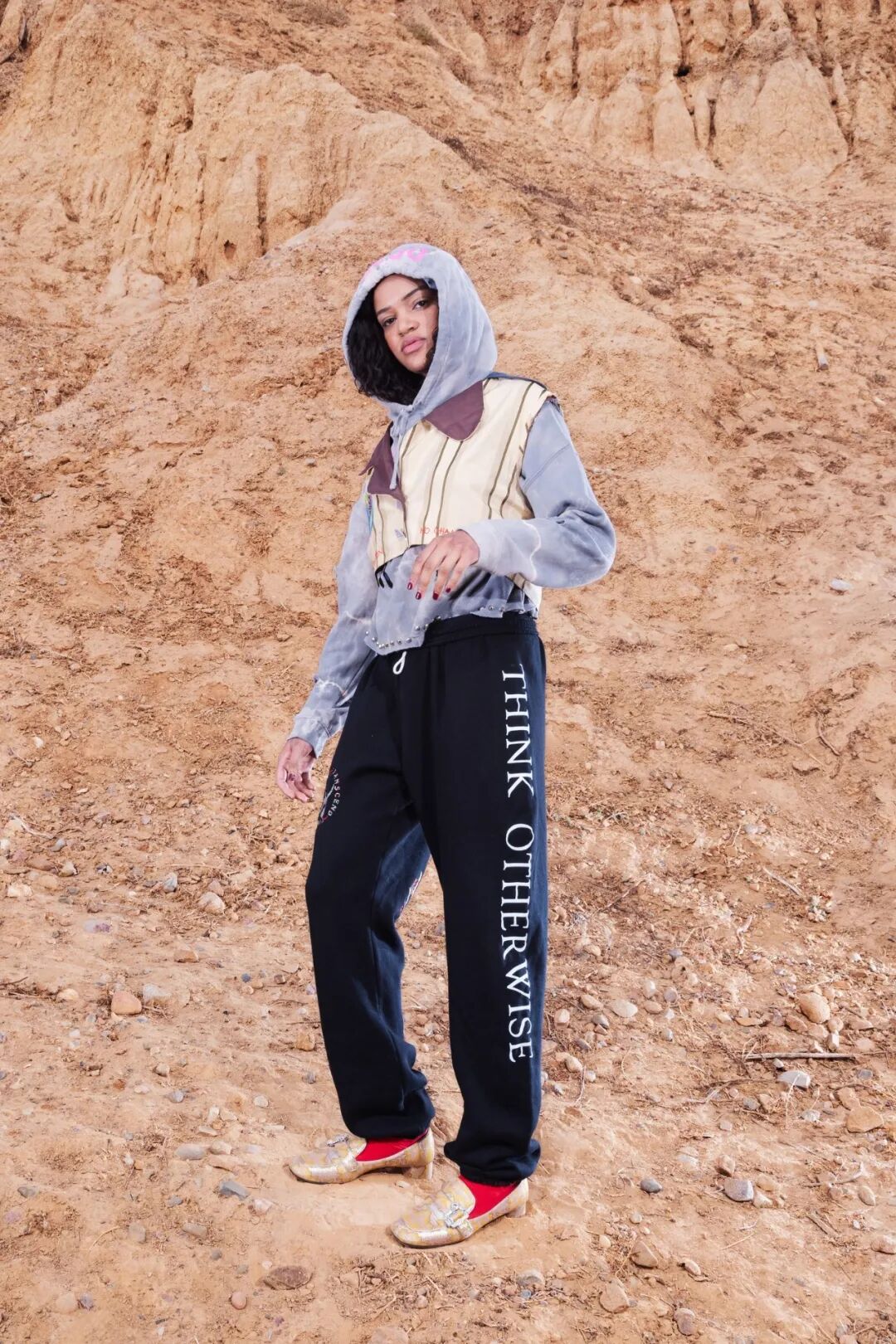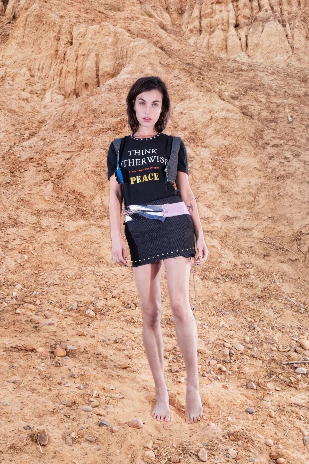 同时延续了以往系列的风格,裤子上印有Savage Capitalism字样,T恤和连衣裙上的Think Otherwise文字依然存在。