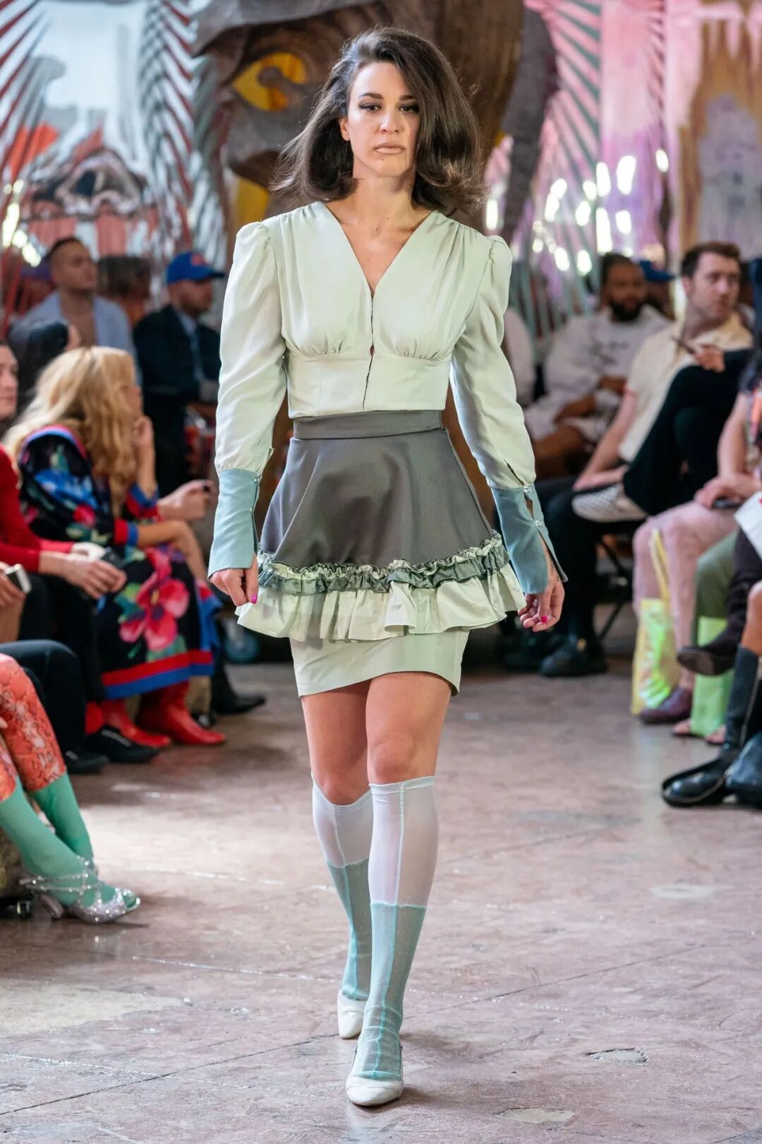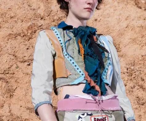 这一季,她将数十种复古T恤拼成华丽的上衣和连衣裙。旧运动服和裤子利用切块拼接的方法制成裙子,西服和裤子。