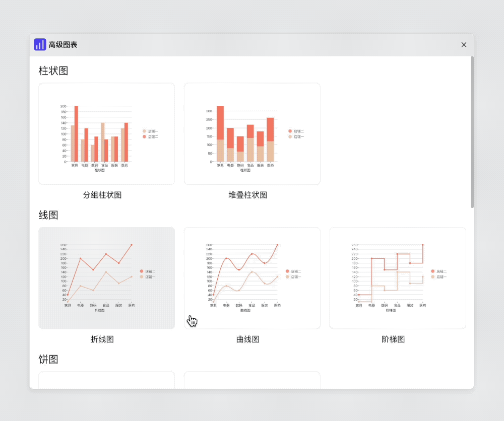 「高级图表」这个插件就能很不错,柱状图、线图、饼图、雷达图、散点图等常用图表都能一键生成,数据、颜色都可以自由修改。