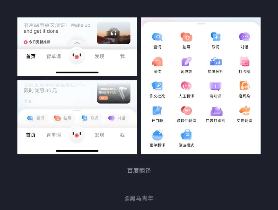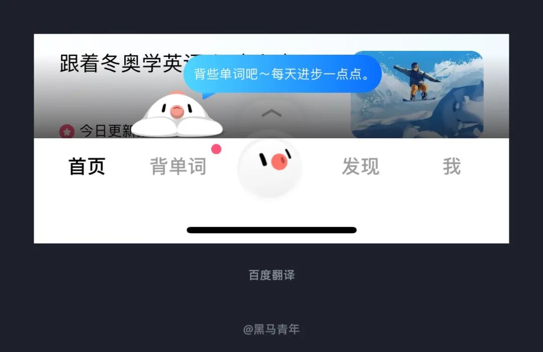 百度翻译 APP 通过情感化的 IP 形象进行功能引导,可爱的形象趴在功能区上,趣味性十足。情感化设计的融入相较于普通的文字浮层,更能吸引用户的关注度。
