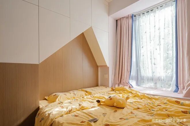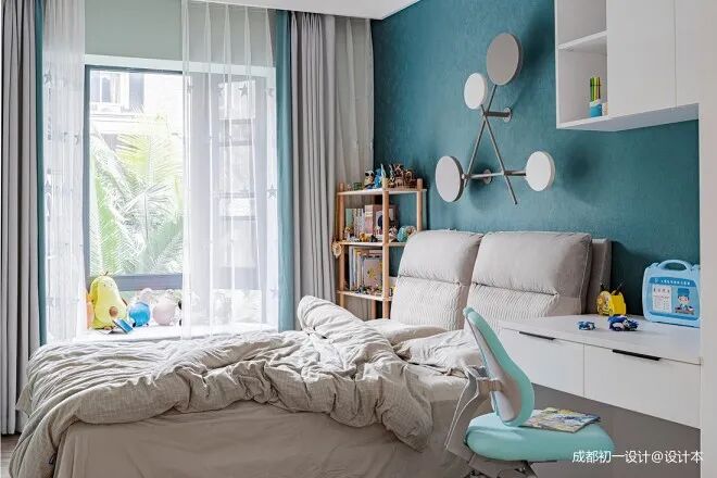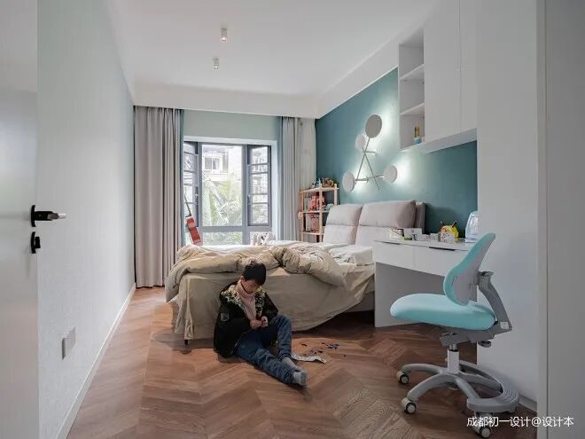 女儿房我们设计了拼接感十足的柜子,让女儿房的乐趣感更足之外,也保证了储物的最大化。背侧天空游鱼的壁布也是我们特意设计定做,让宝贝有一个更美丽的卧室空间。
