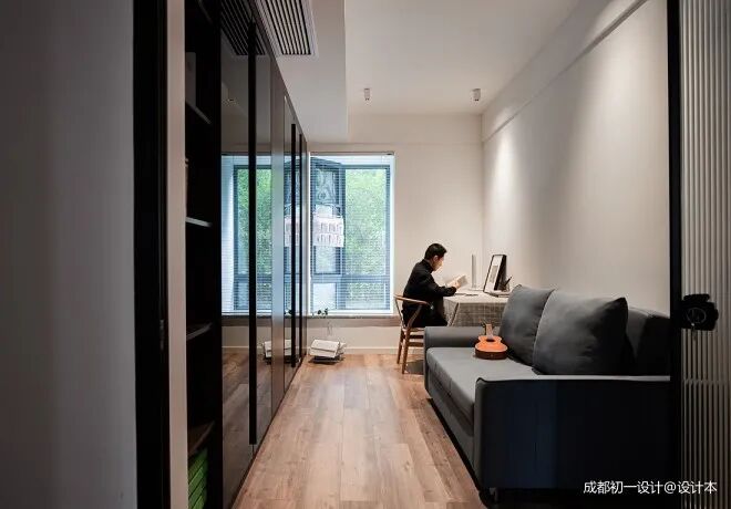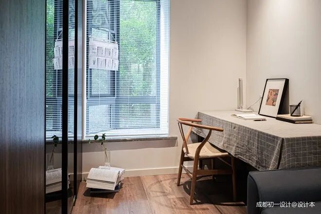 书房简单、自然的设计,保证屋主回家后的安静学习。百叶窗的设计也方便了后期的光照亮度与私密性的控制。