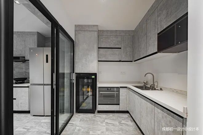 厨房采用了纹理跳跃的柜门,统一又协调。西厨设计了水盆及水果冰箱、烤箱等的功能,方便屋主后期生活的使用。