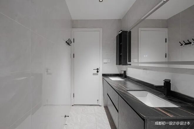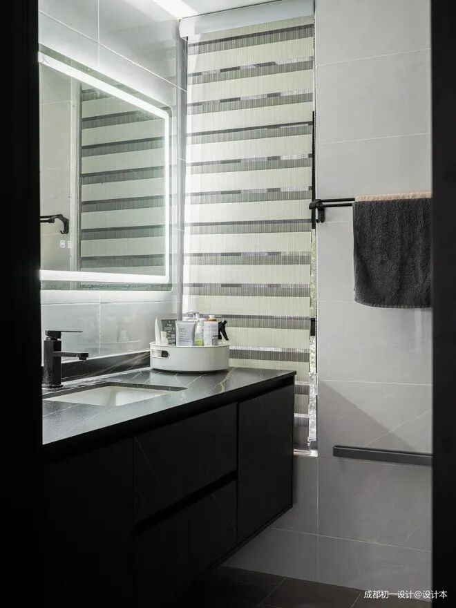 主卫一角。台下盆的设计,方便后期打理与使用。可折叠百叶窗最大化的保证了主卫的隐私与使用。