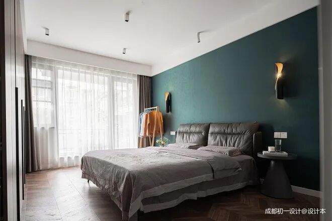 深绿色的壁纸,让主卧有了亮暗层次的对比之外,也让居住入睡变得更为容易自然。