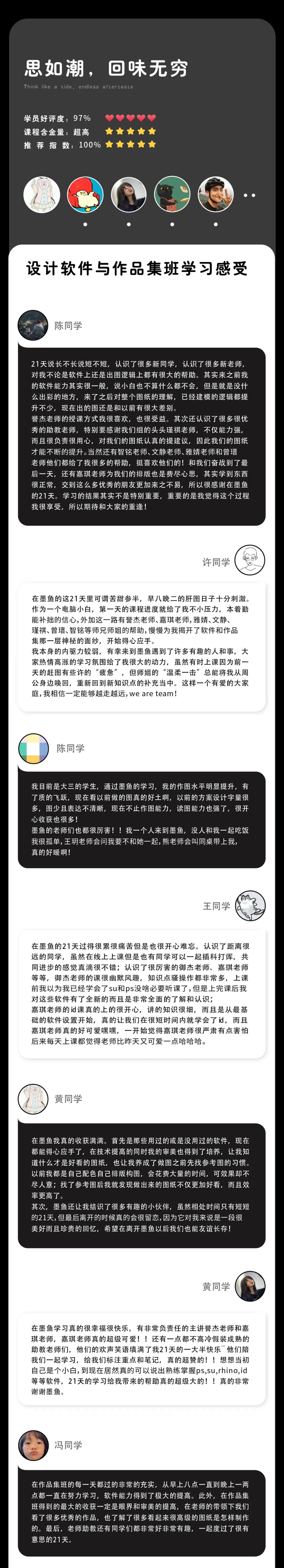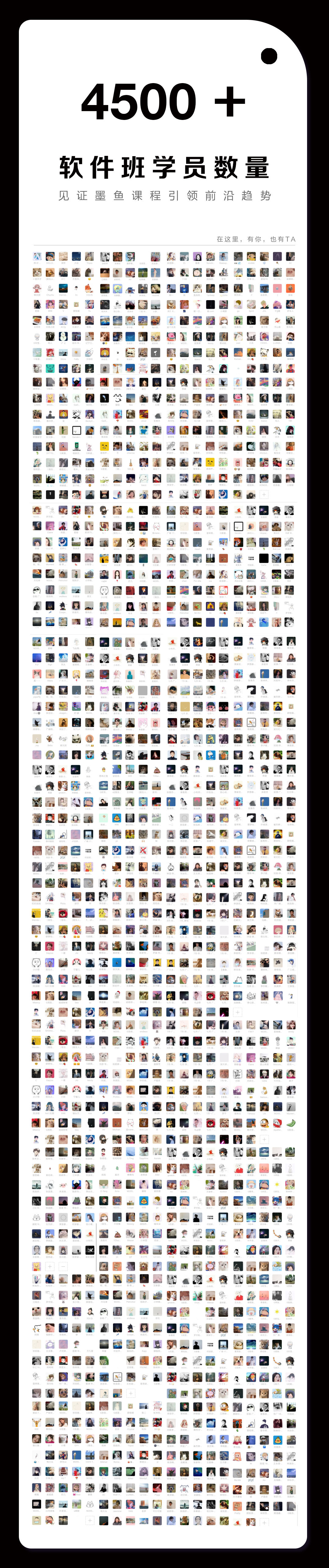 前沿的教学理念和非同凡响的作品实力,为墨鱼软件班课程赋予了极致口碑和超速传播,再加上线下超愉快的学习氛围和“与你同在”,穿透电脑屏幕来到线上学员的学习感官中,让这段学习之旅变成时光经典。