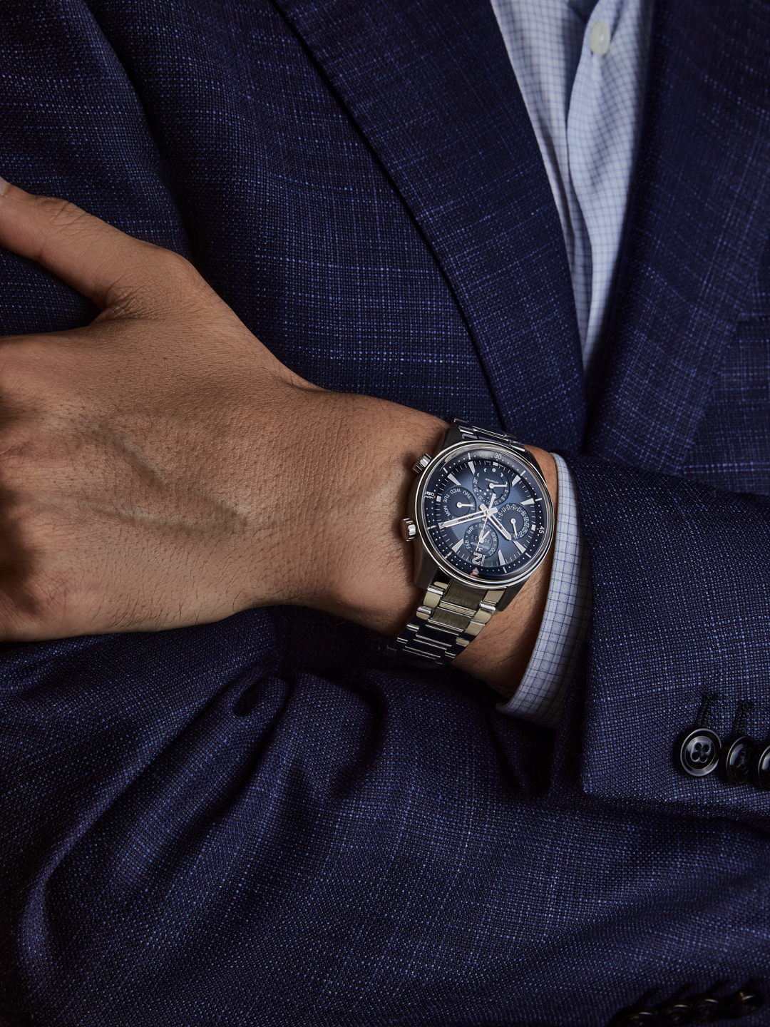 虽然是复杂功能表,且有100米防水性能,但这款腕表厚度不到12毫米,尺寸是常规的42毫米,可以轻松缩回衬衫袖口,再加上多种表带选择,能够搭配出多种佩戴风格。