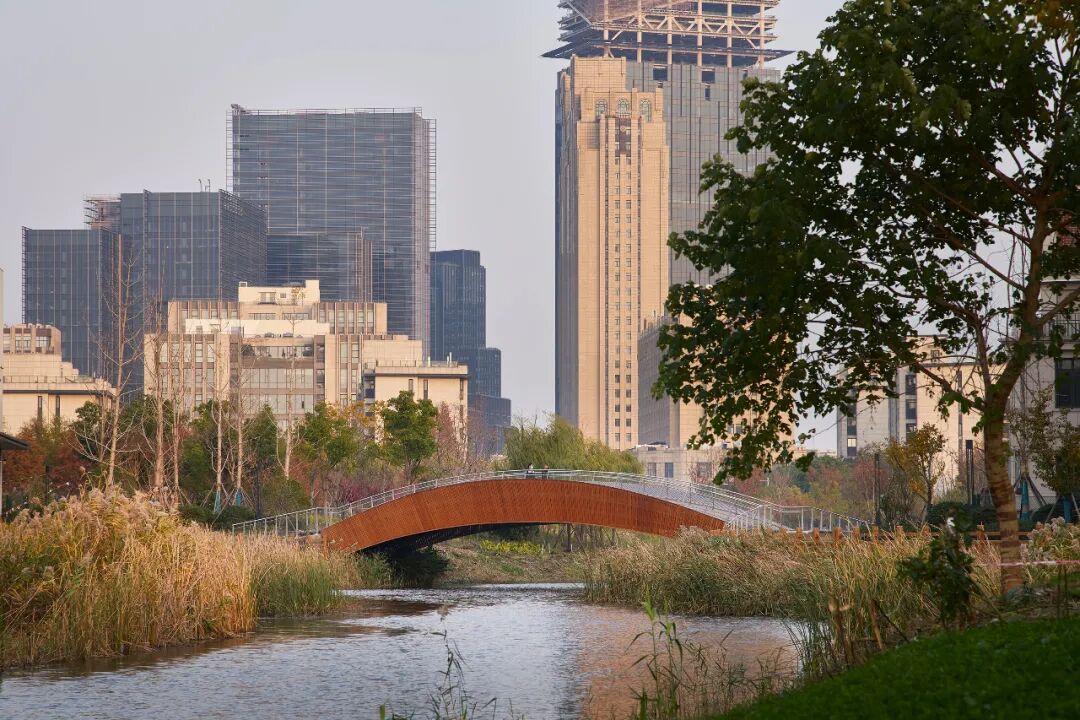 设计以两条柔和的曲线控制桥身线条,中间高而宽、两端低而窄,勾勒出修长而富有张力的体量,像水鸟起飞时张开的翅膀,充满瞬时的美。