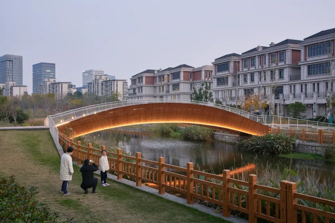 木格栅以单一自然材料的模数化阵列实现变化的造型,格栅之间的间隙既节约了材料,也使得桥身在近看时拥有细腻的肌理变化。