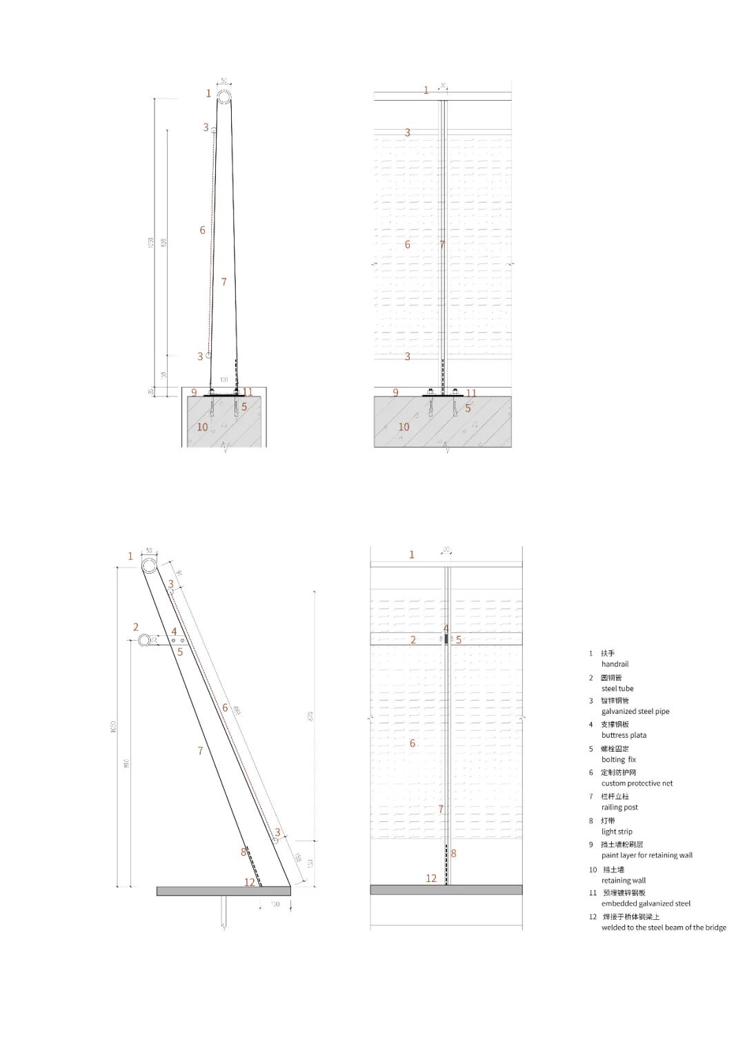 栏杆设计选择了向内倾斜的双夹片扁钢形式,超薄的单片扁钢实现了在景观视野上最小化的构件可视面,双夹片的构造既增加了组合强度,又在底部集合了泛光照明灯具,一举两得。