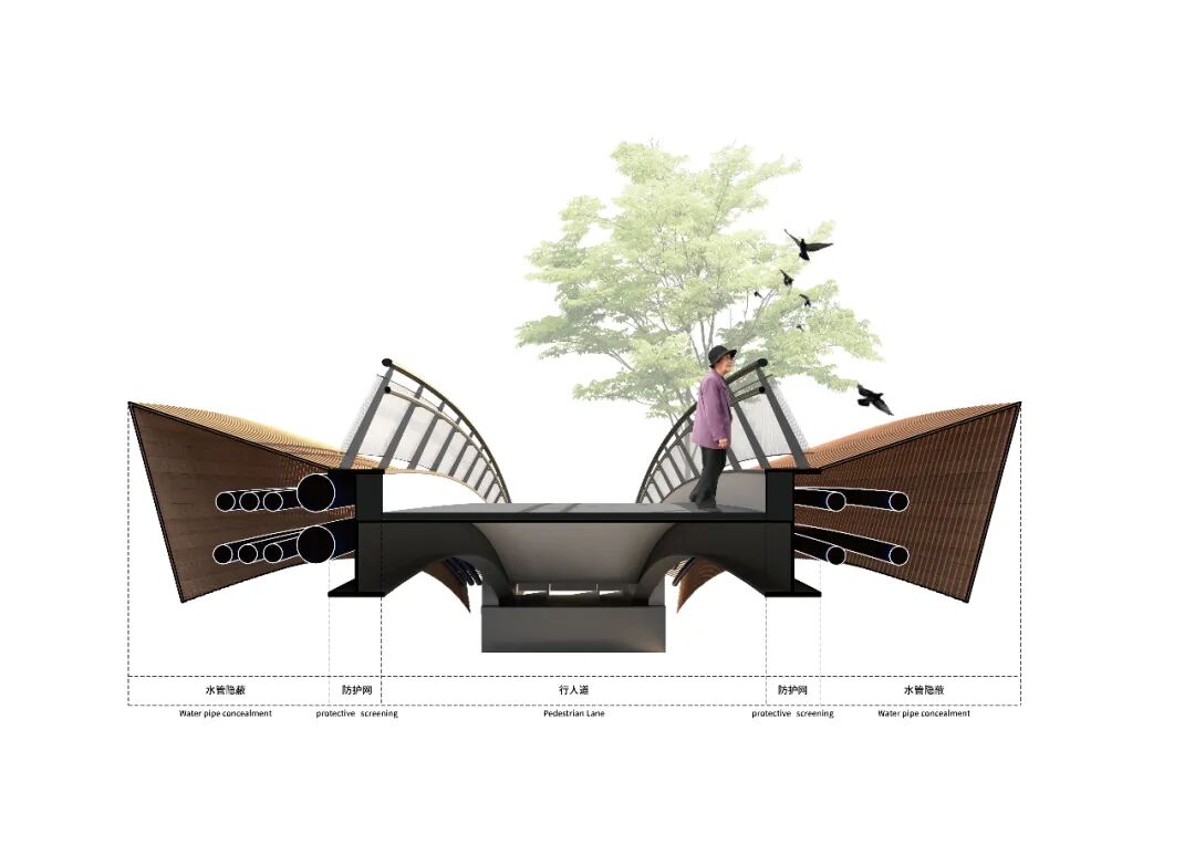 而底部向下、向内侧收缩的趋势也很好的削弱了因为包裹水管而带来的厚重感,使得桥体在每个不同的视角下都充满变化。