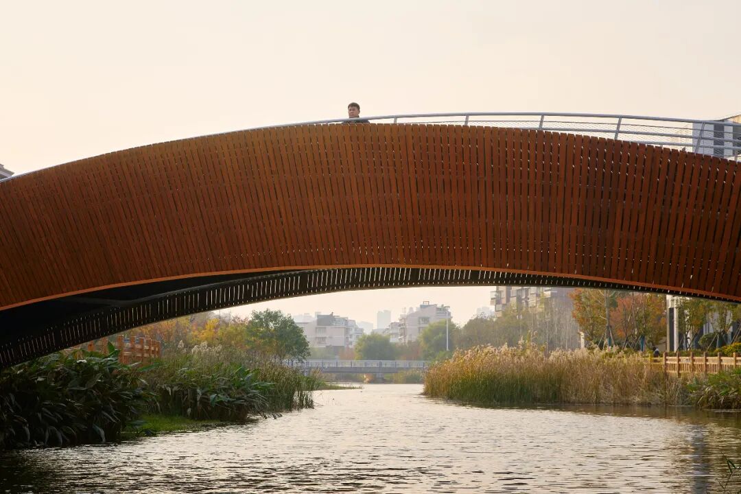 这一系列的细节设计使得便民桥除了整体飘逸的造型之外,还有精致挺拔的构造细节,代表自然的木头和代表科技的金属在此碰撞,又一同融入周边野趣的自然。