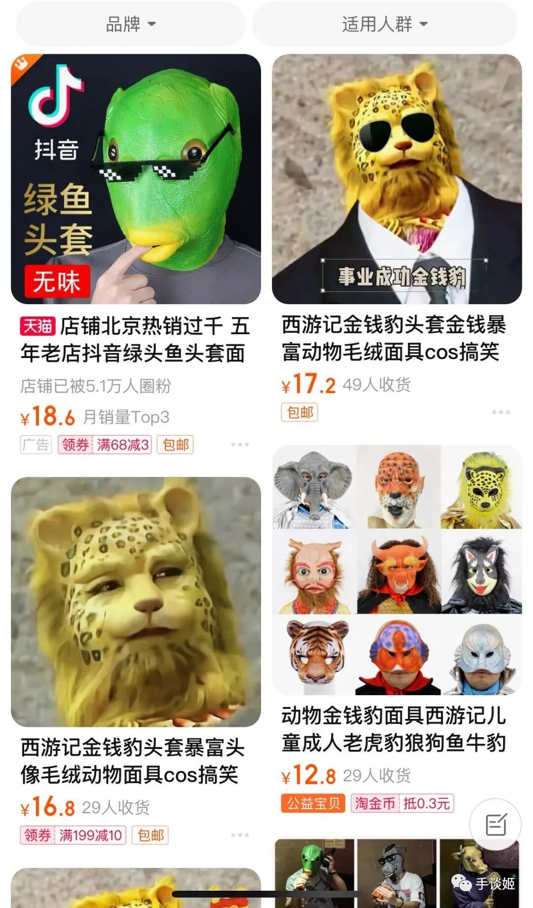 去淘宝一搜,果不其然,已经有不少商家开始连夜缝制豹子头了,但最火的还是上过央视的鱼头,虽然春晚捧红人似乎不太管用了,但是捧红头套还是有一手的。