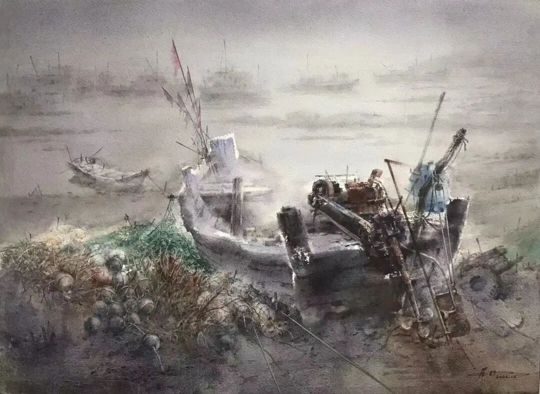 瞿野《渔港系列-等待》水彩 56x76cm 广东深圳