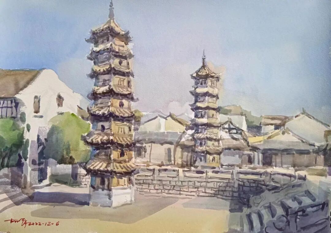 胡军《南翔古镇古塔》水彩 39x54cm 上海