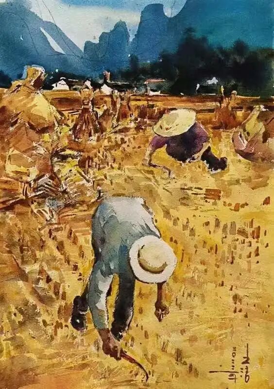 王洁   《拾稻穗》水彩 36×51cm 广西