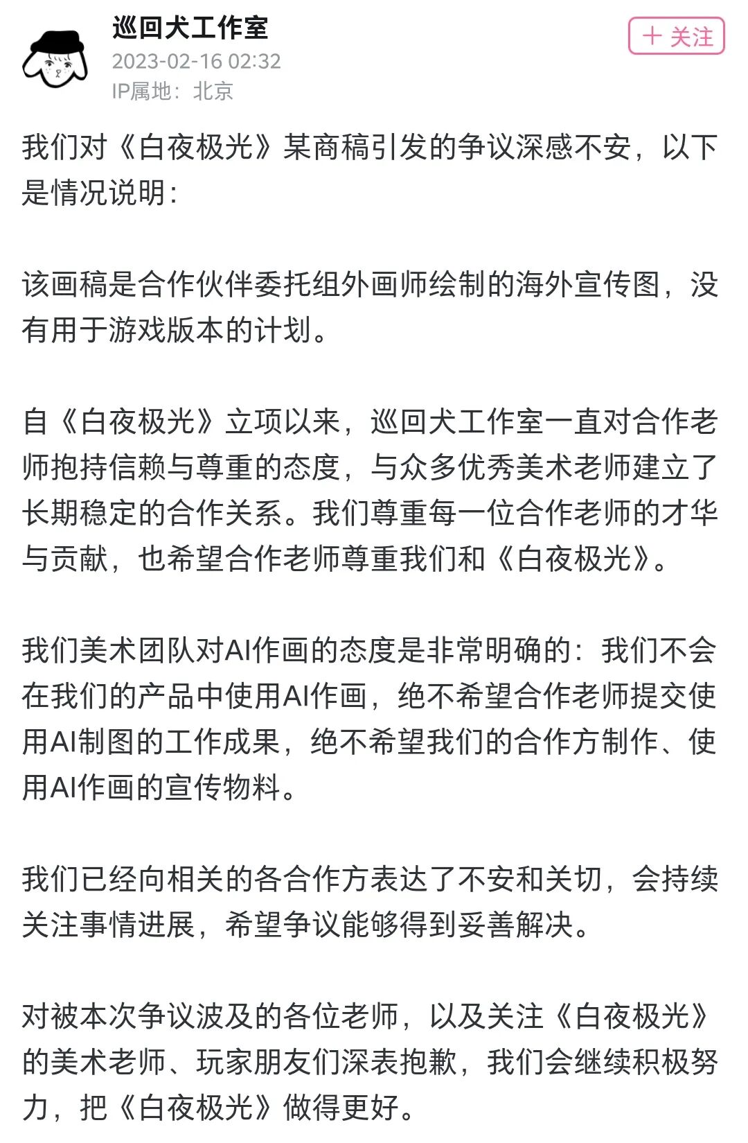 短时间里,商业产品内使用AI作画的争议迅速发酵,当然这次涉及的商业产品《白夜极光》也被卷入其中。就在当天凌晨2点,《白夜极光》制作组巡回犬工作室发布声明,表明争议画作为宣传商稿,无用于游戏版本的计划。同时制作组也表明立场:“我们不会在我们的产品中使用Al作画,绝不希望合作老师提交使用Al制图的工作成果,绝不希望我们的合作方制作、使用AI作画的宣传物料。”