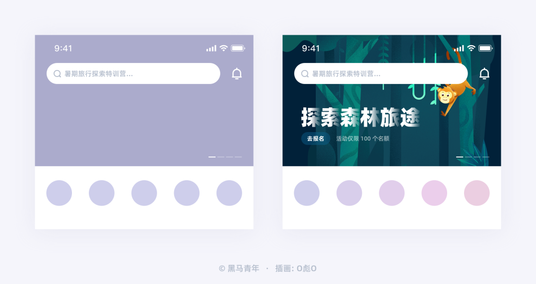 将插画作为 Banner 设计主视觉配图,在项目中也是非常普遍,作为作品包装来说绝对是提高视觉感的重要技巧。