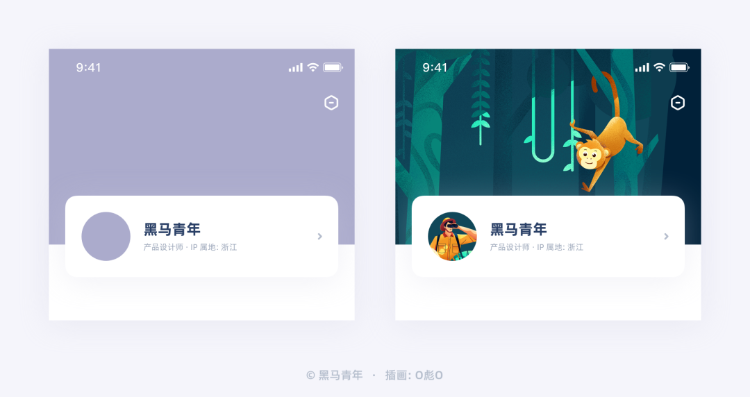 近些年个人中心头部区域背景设计被重视起来,除了通过品牌色和照片形式强化以外,弥散光、流体渐变、情感化插画等形式也十分流行。特别是插画的表达方式,带来的风格性和视觉感都是值得推荐的。