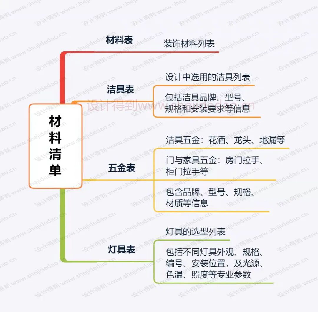 材料清单里,则要有材料表、洁具表、五金表、灯具表。