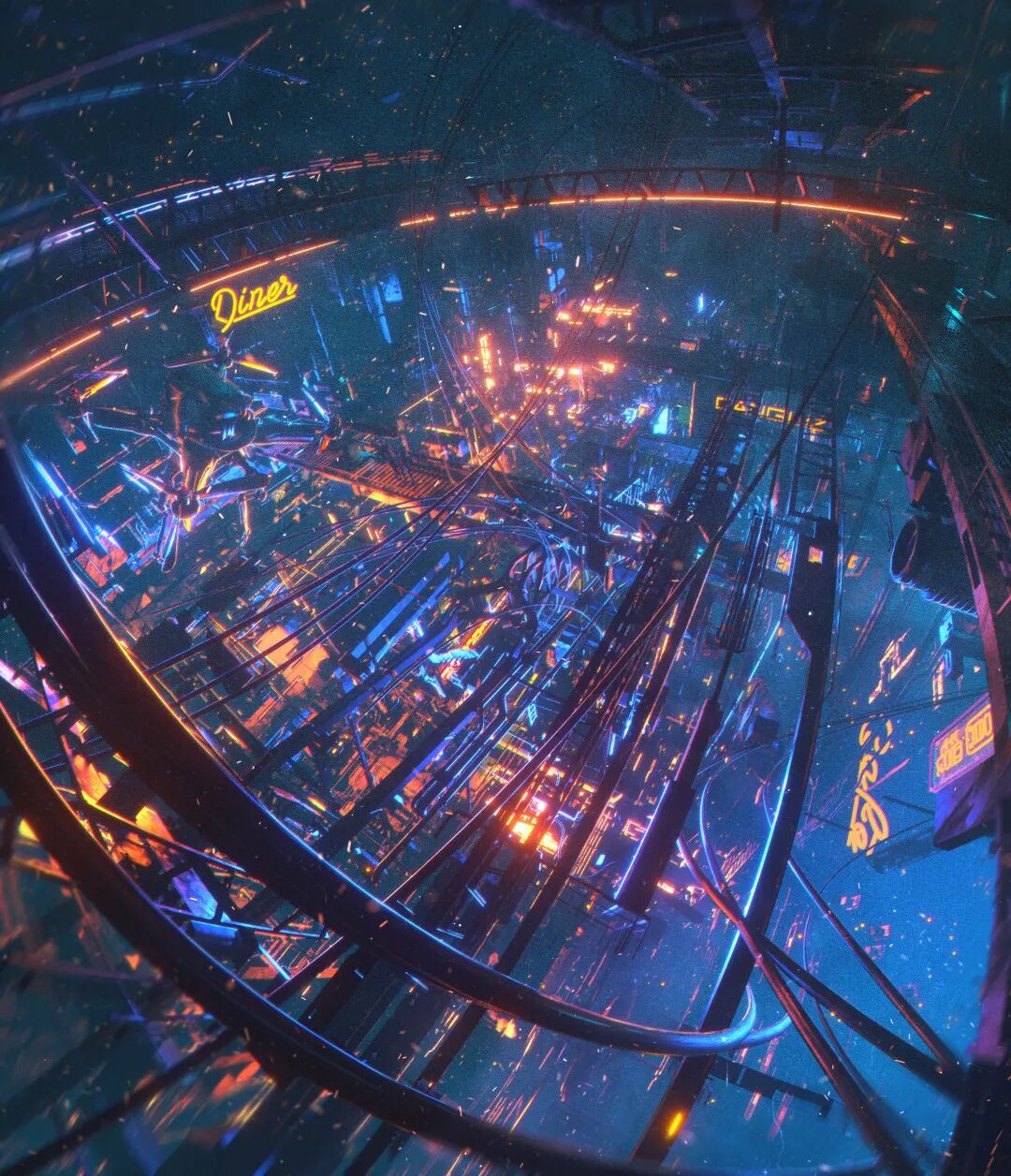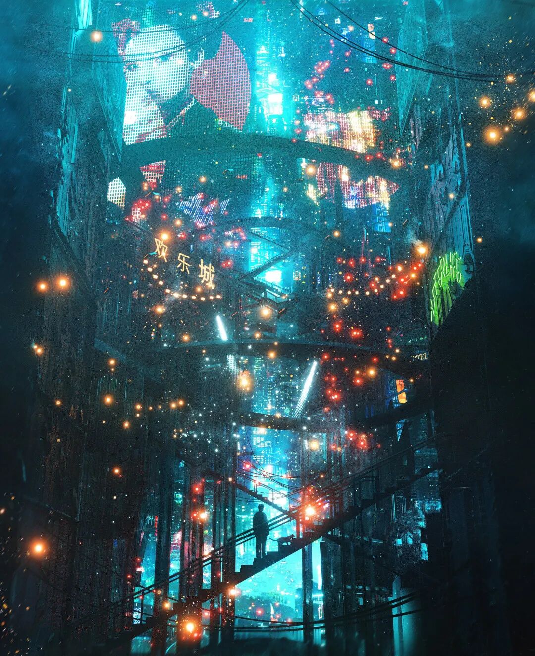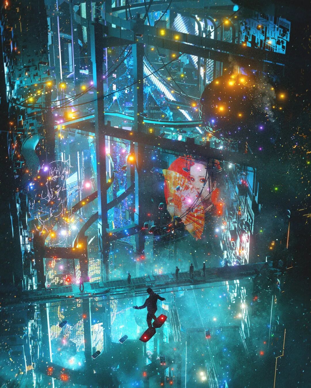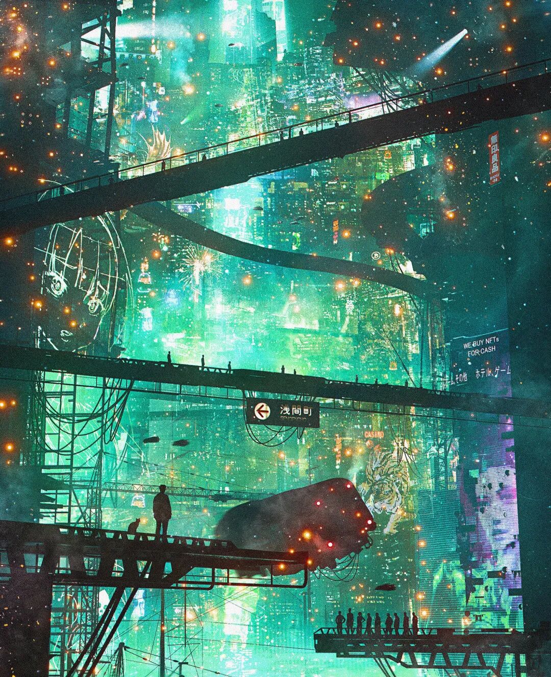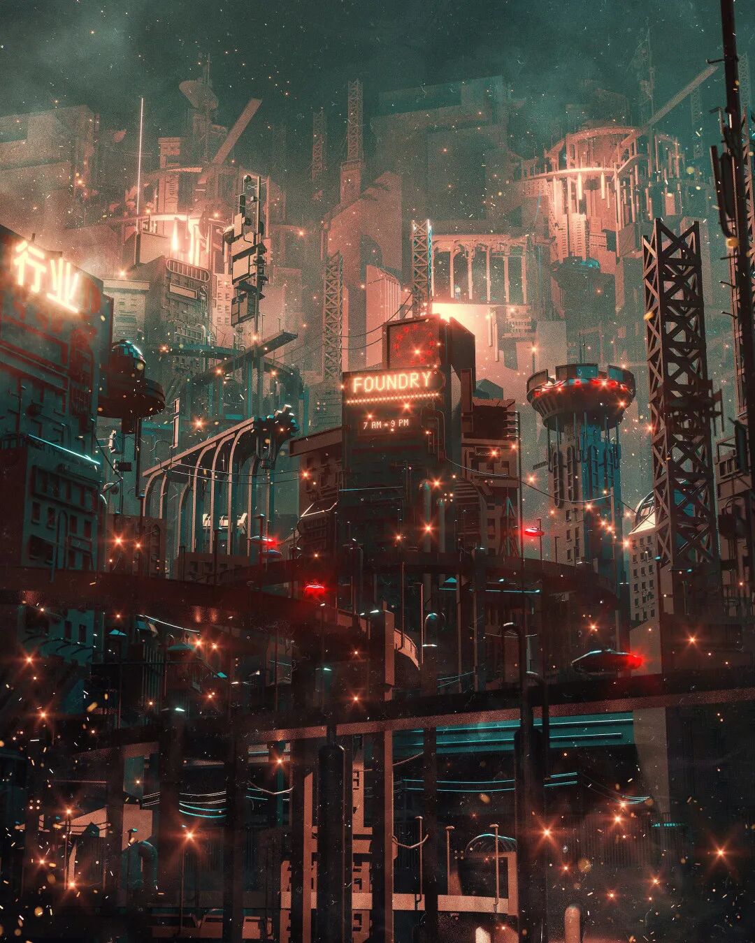 作为95后的Dangiuz创作深受《银翼杀手》、《攻壳机动队》等影视影响,所以他的作品一直以赛博朋克风格的反乌托邦未来城市为主题。