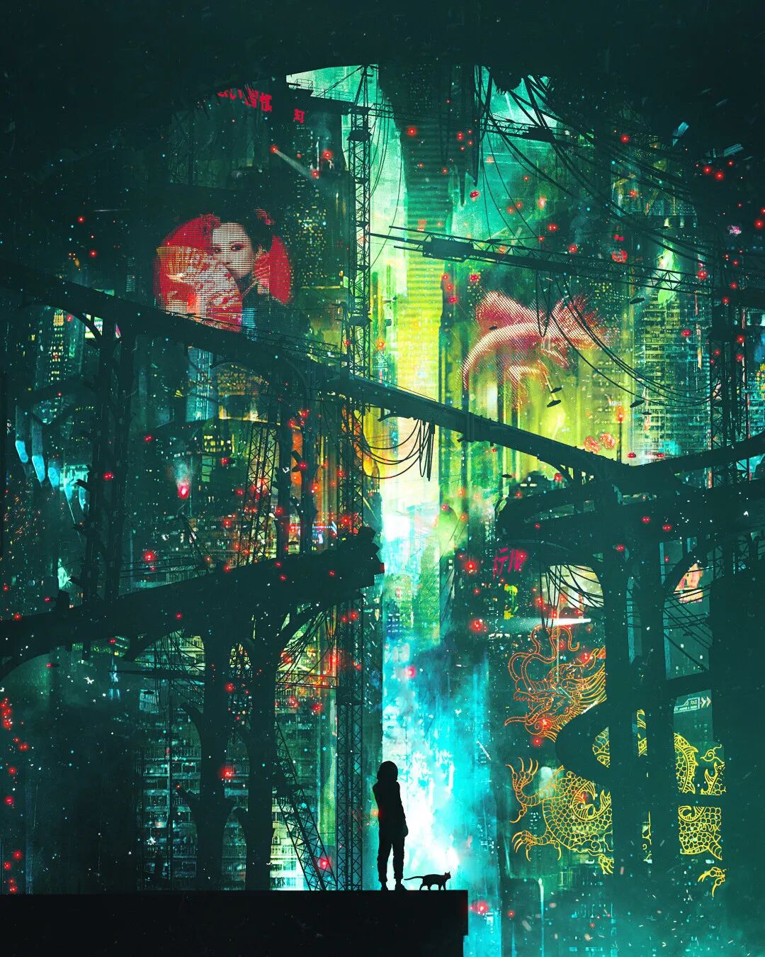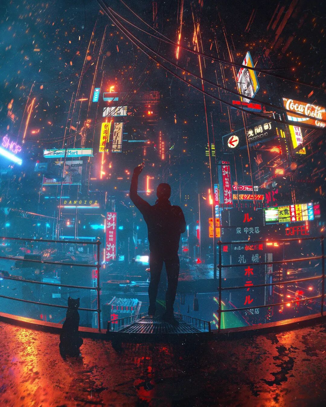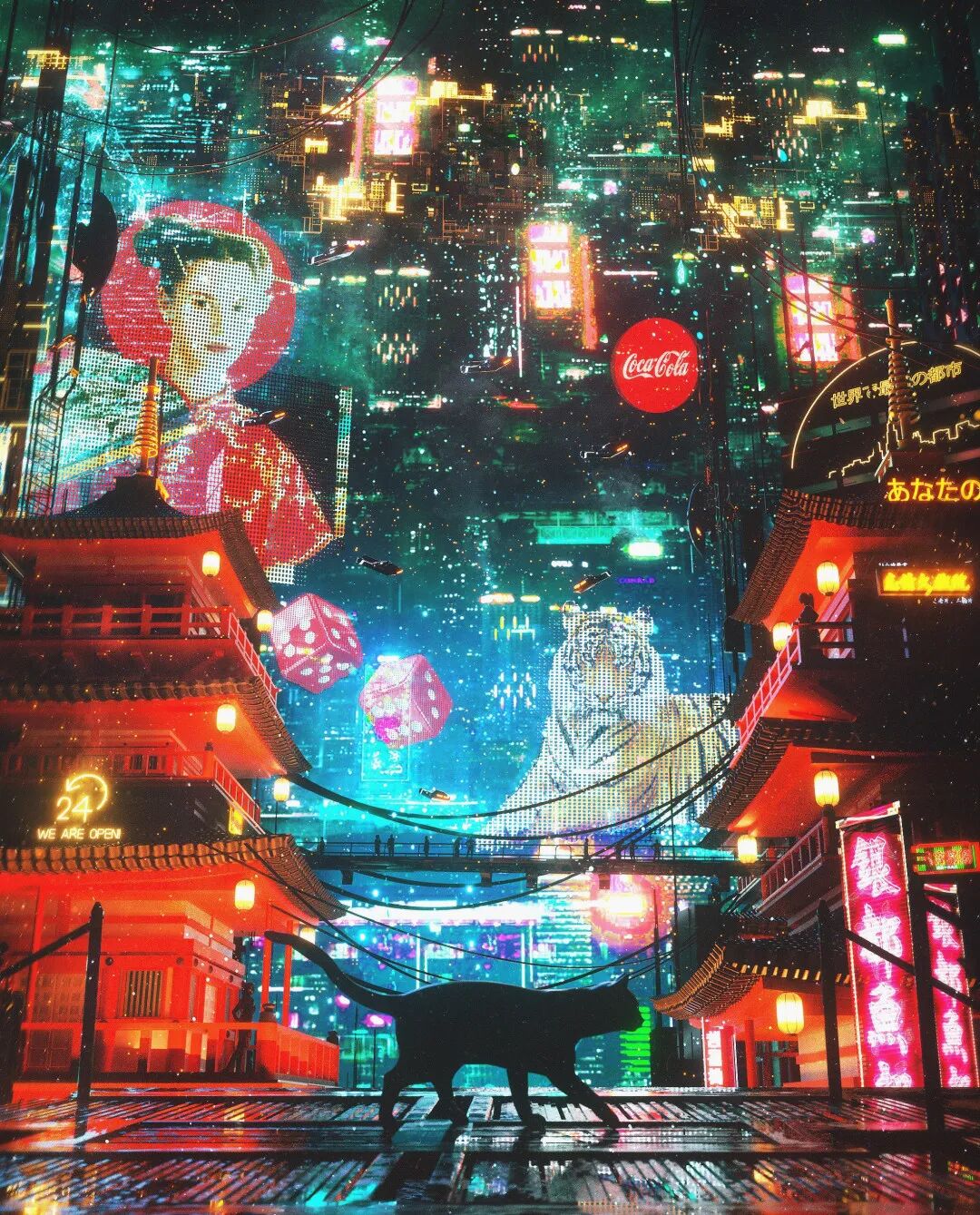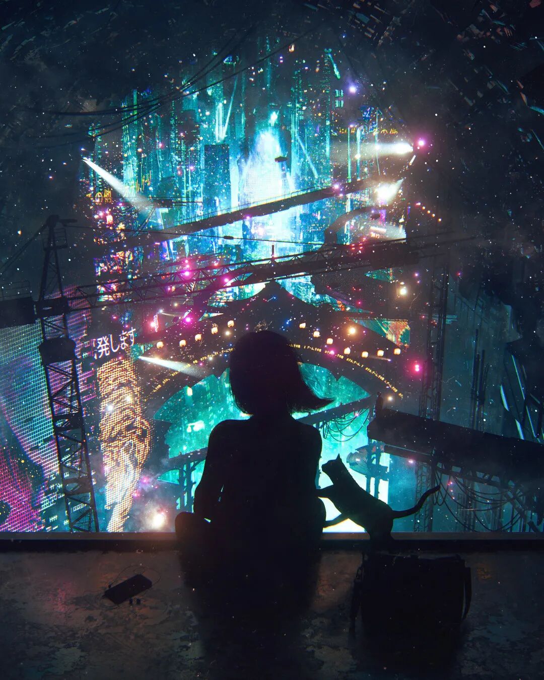 Dangiuz作品中常常添加女孩和猫的元素,闪烁霓虹展现出了浓浓的科技感,而个体的孤独则在繁华浩大的都市对比之下更加明显,使得作品整体的画面张力十足。