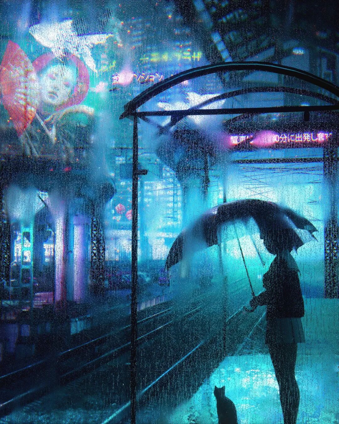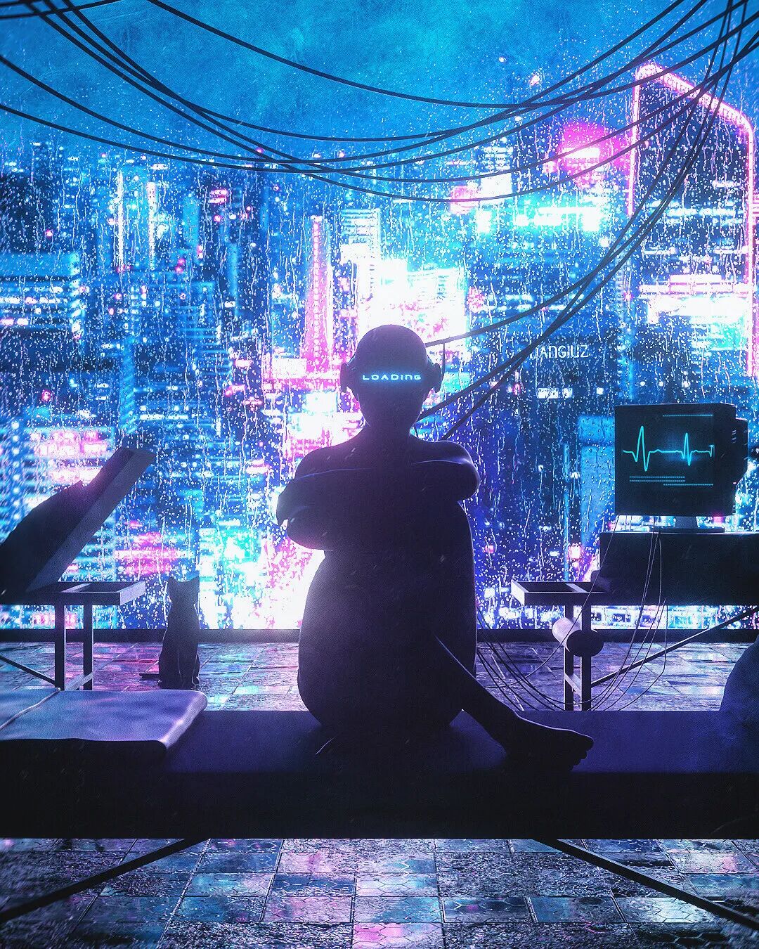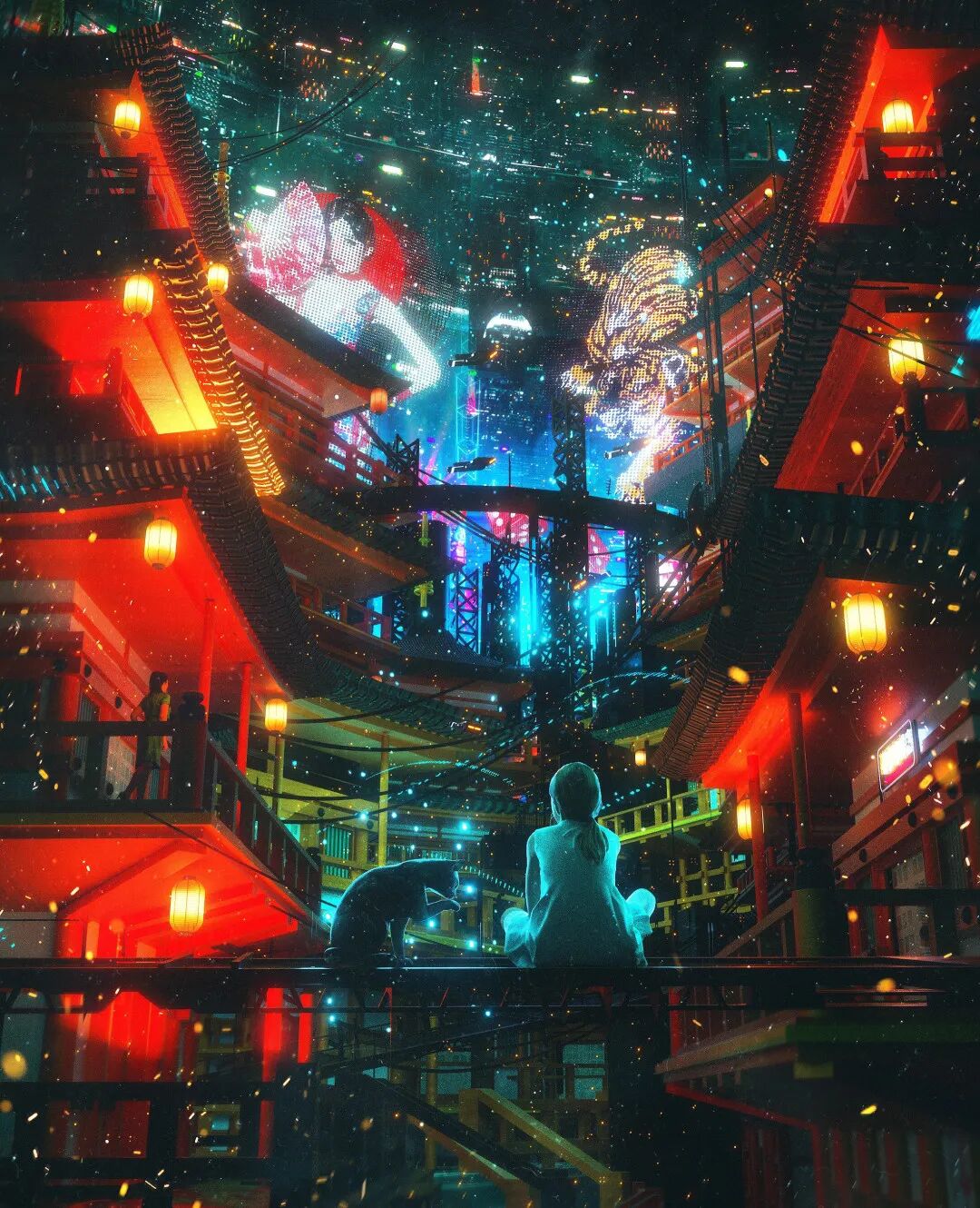 Dangiuz作品中常常添加女孩和猫的元素,闪烁霓虹展现出了浓浓的科技感,而个体的孤独则在繁华浩大的都市对比之下更加明显,使得作品整体的画面张力十足。