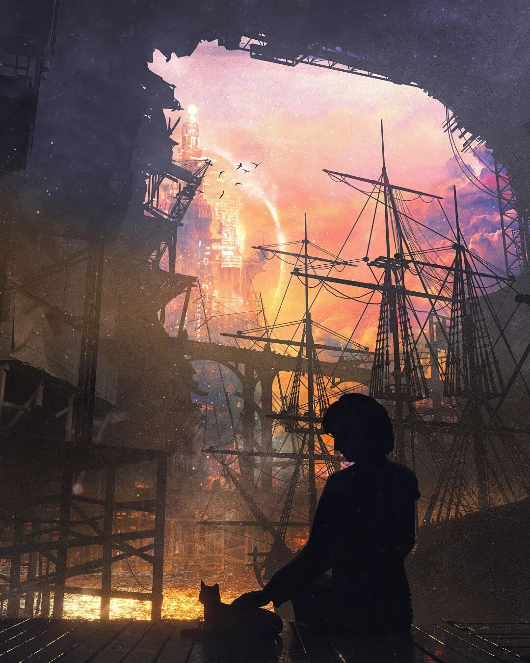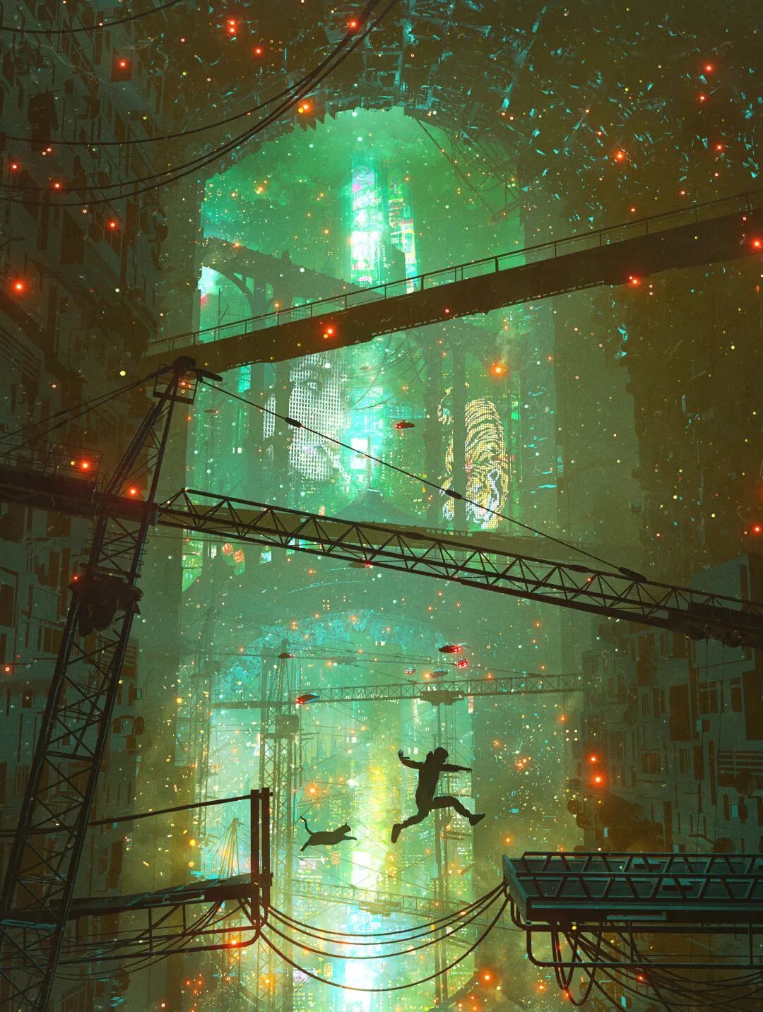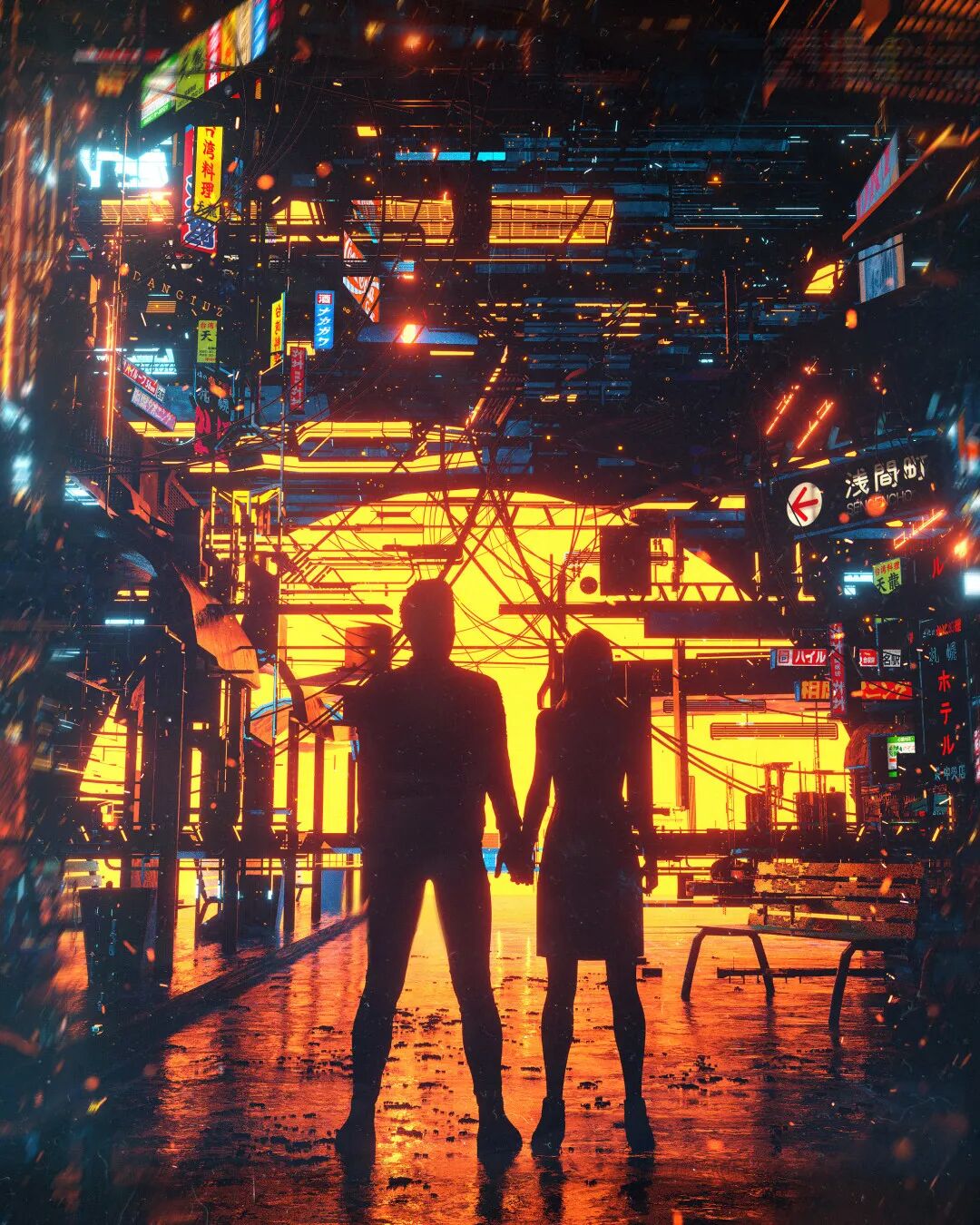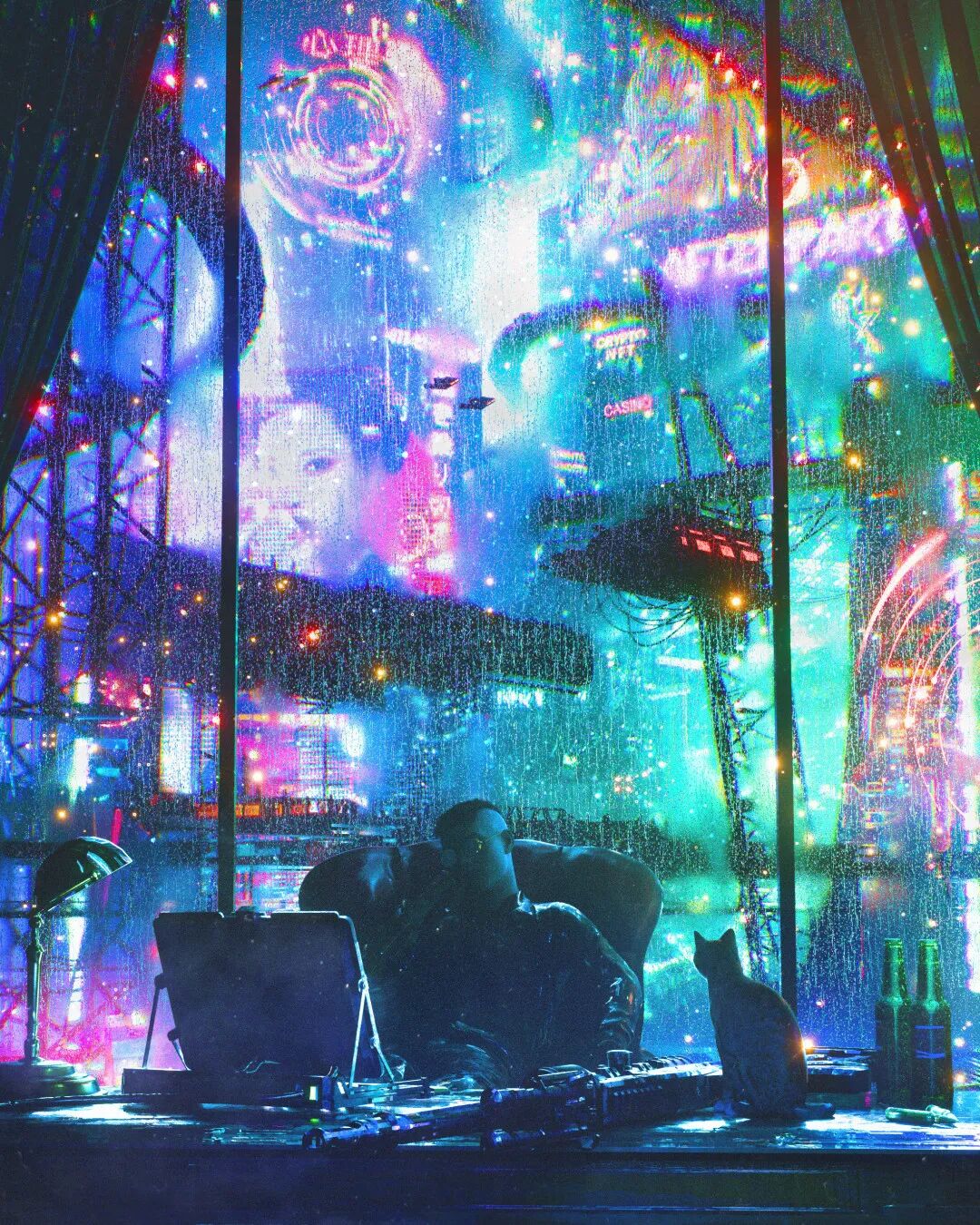 Dangiuz作品中常常添加女孩和猫的元素,闪烁霓虹展现出了浓浓的科技感,而个体的孤独则在繁华浩大的都市对比之下更加明显,使得作品整体的画面张力十足。