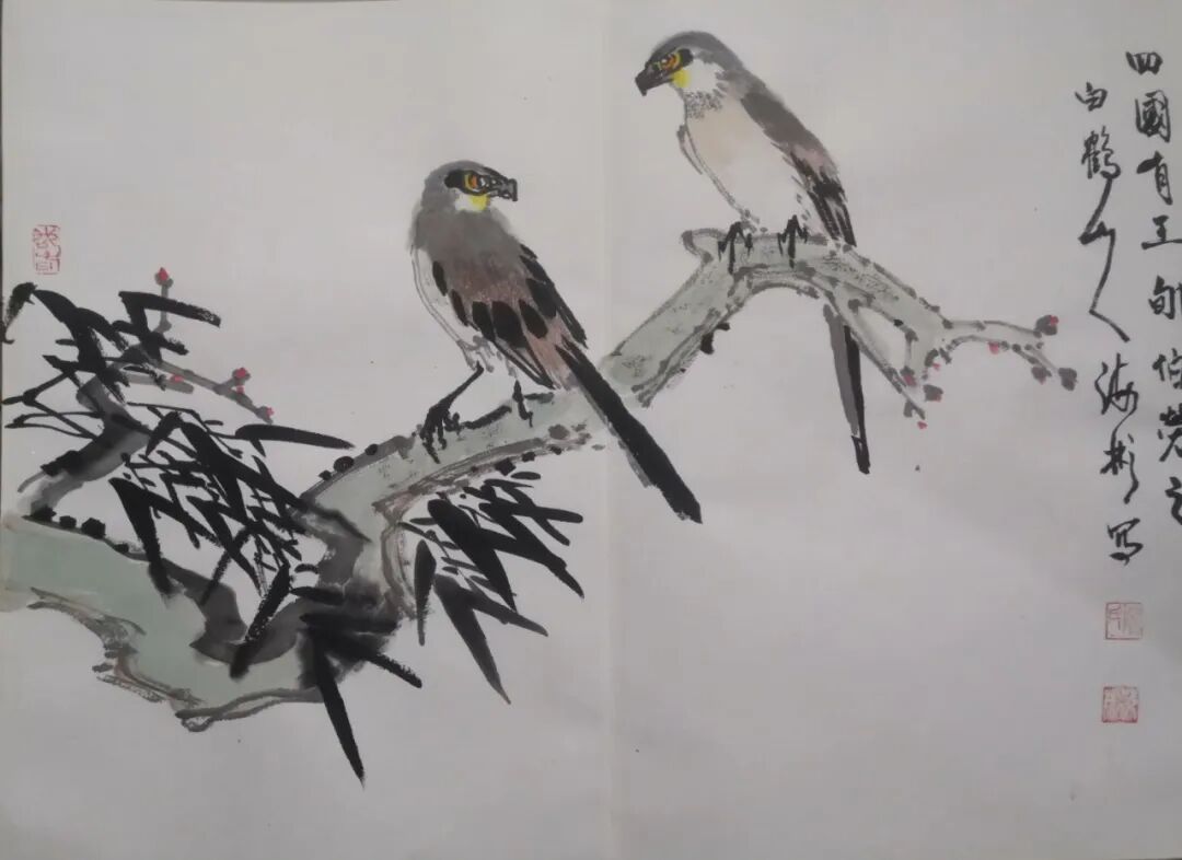 徐海彬先生生于1931年5月,浙江兰溪人,自幼酷爱绘画,师从江南名家金鸣秋先生,专攻花鸟。后拜山水名家余任天先生门下,接受潘天寿“继承、变革”的观点,以承求草,传统出新,临摹遍古近画谱,从海上画派上溯到明清宋元,传统的笔墨功力已臻上乘,骨线用笔,随类赋彩,得心应手,娴熟自如。徐老以造化为师,对鸟类飞鸣食宿作了长达60年的观察与体悟,与生稿积箱盈架,并练就一套默记背写的功夫。