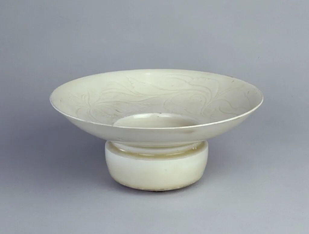 宋代定窑、龙泉窑、越窑都有制品传世,造型变为由下、下两截组成,上部为盘形,下为扁圆腹,浅圈足。
