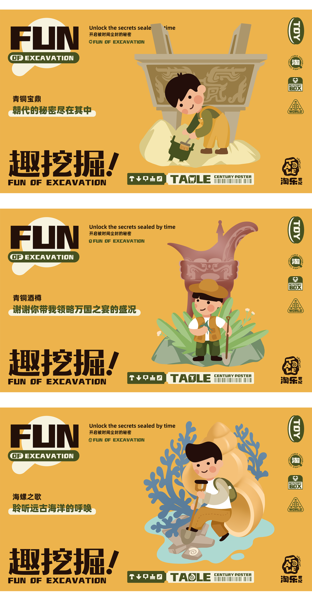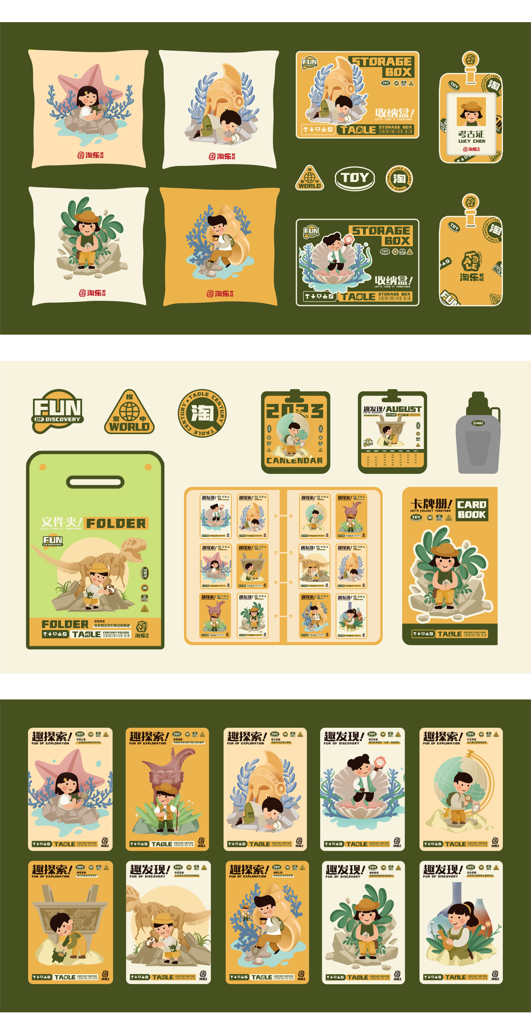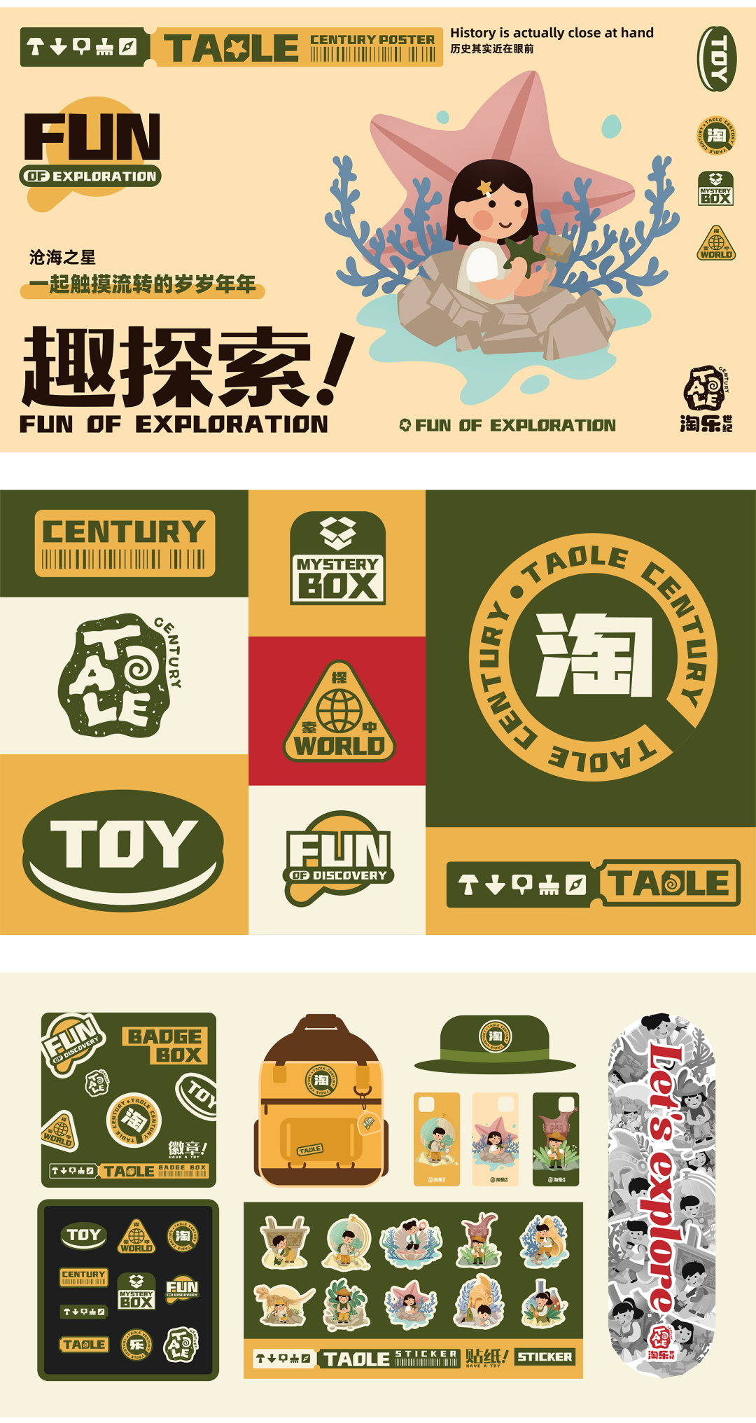 品牌名拼音“TAOLE”原创字体的融入,突显品牌信息,字母“O”抽象变形为海螺,寓意待开发的宝藏,增强童趣、益智的场景化打造;
