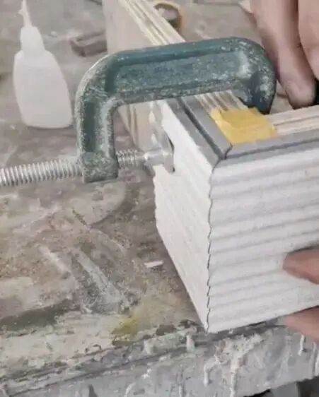 b、安装转角材:在阳角处安装转角材,通过专用胶将转角材与板材进行粘接。