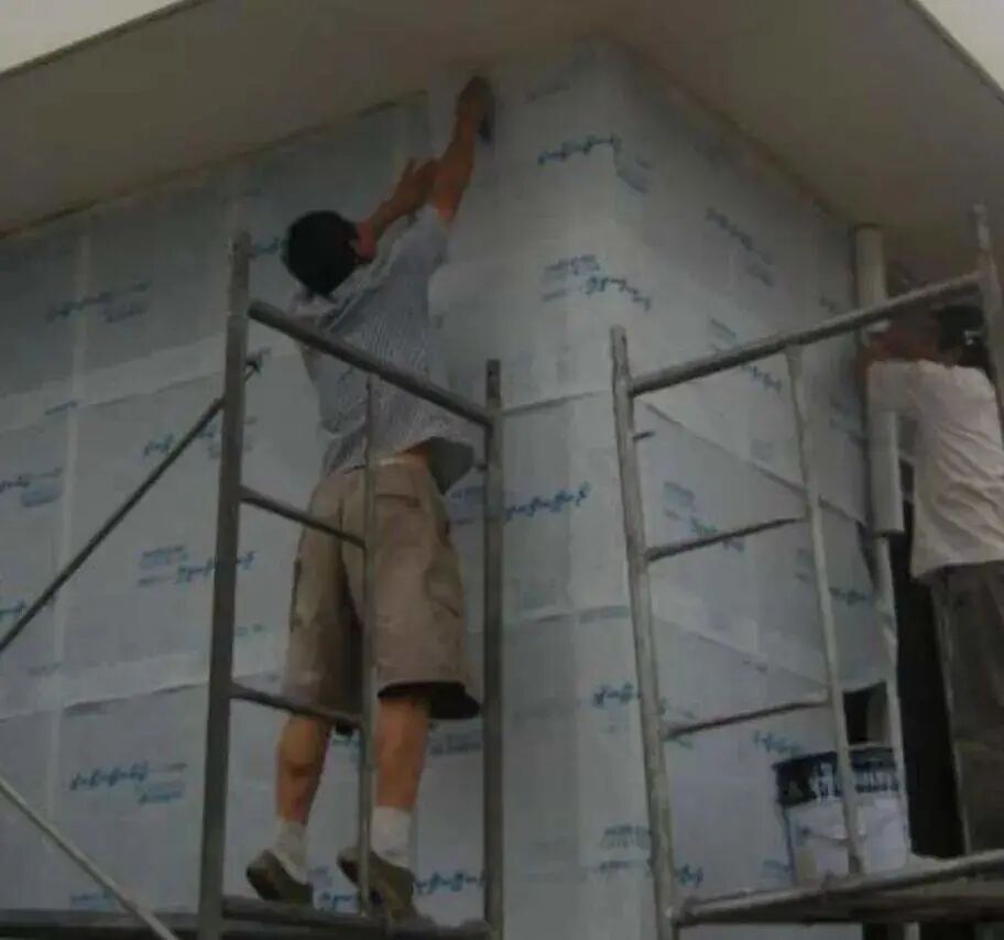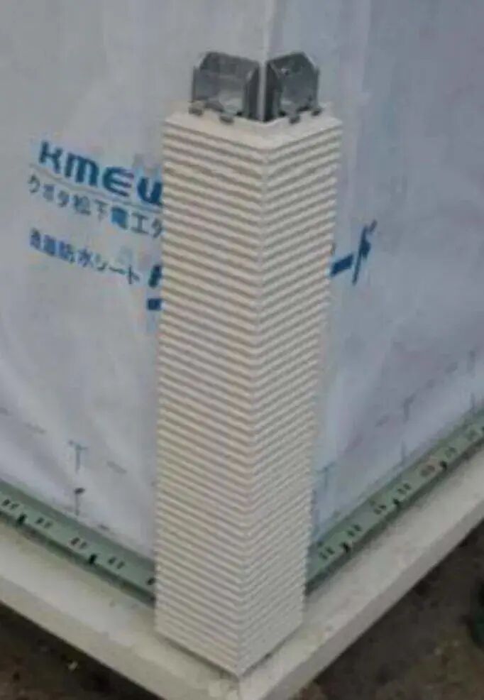 内转角处铺设透湿防水纸后,固定内转角底板,固定一侧外墙板,外墙板做到透湿防水纸为止。
