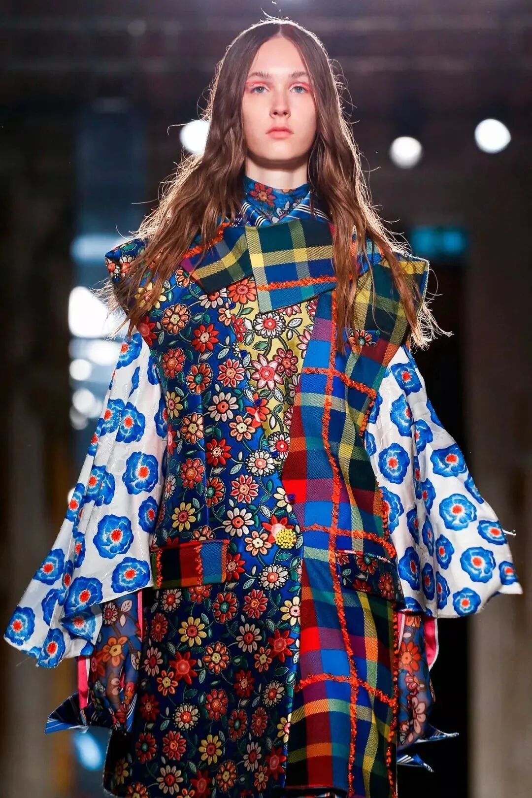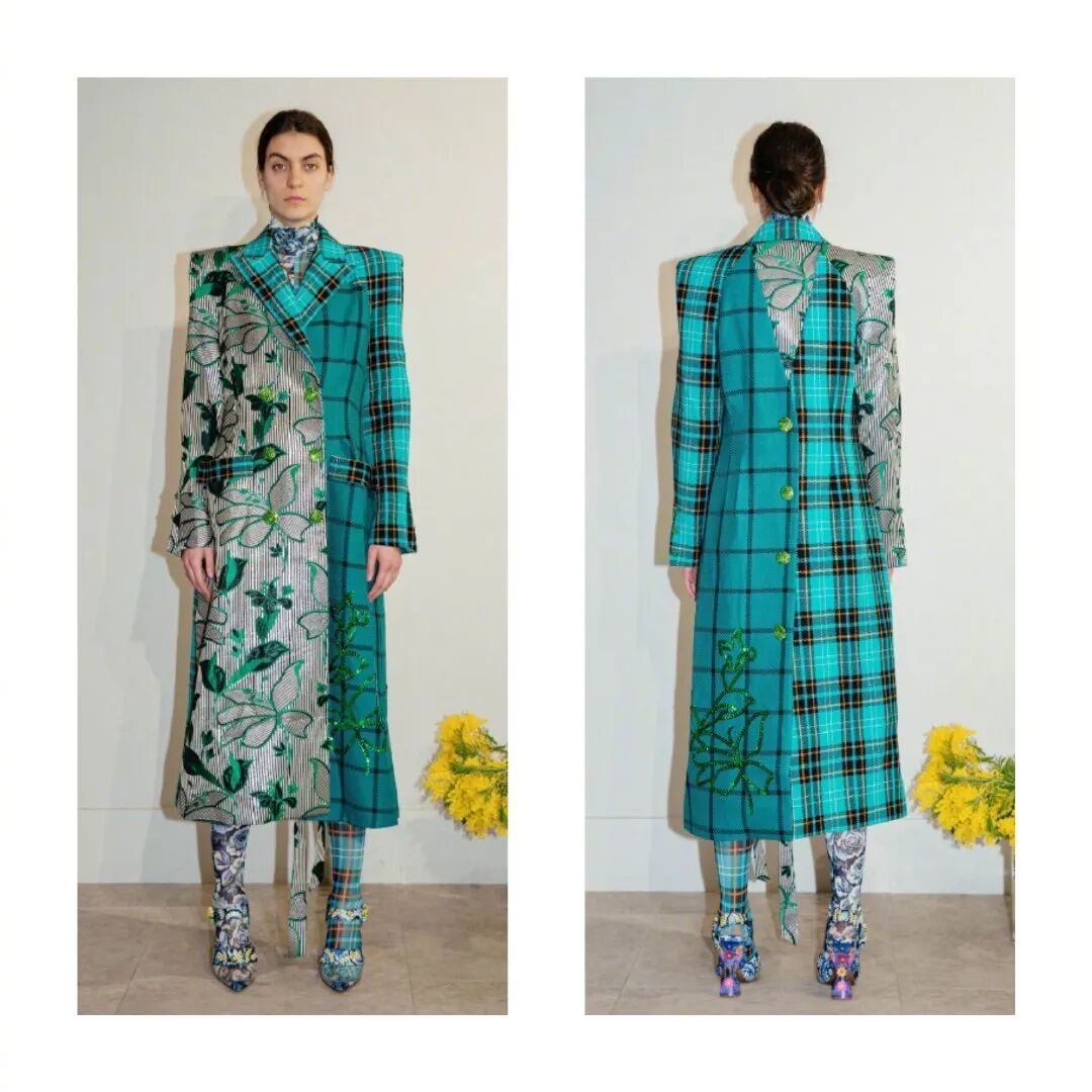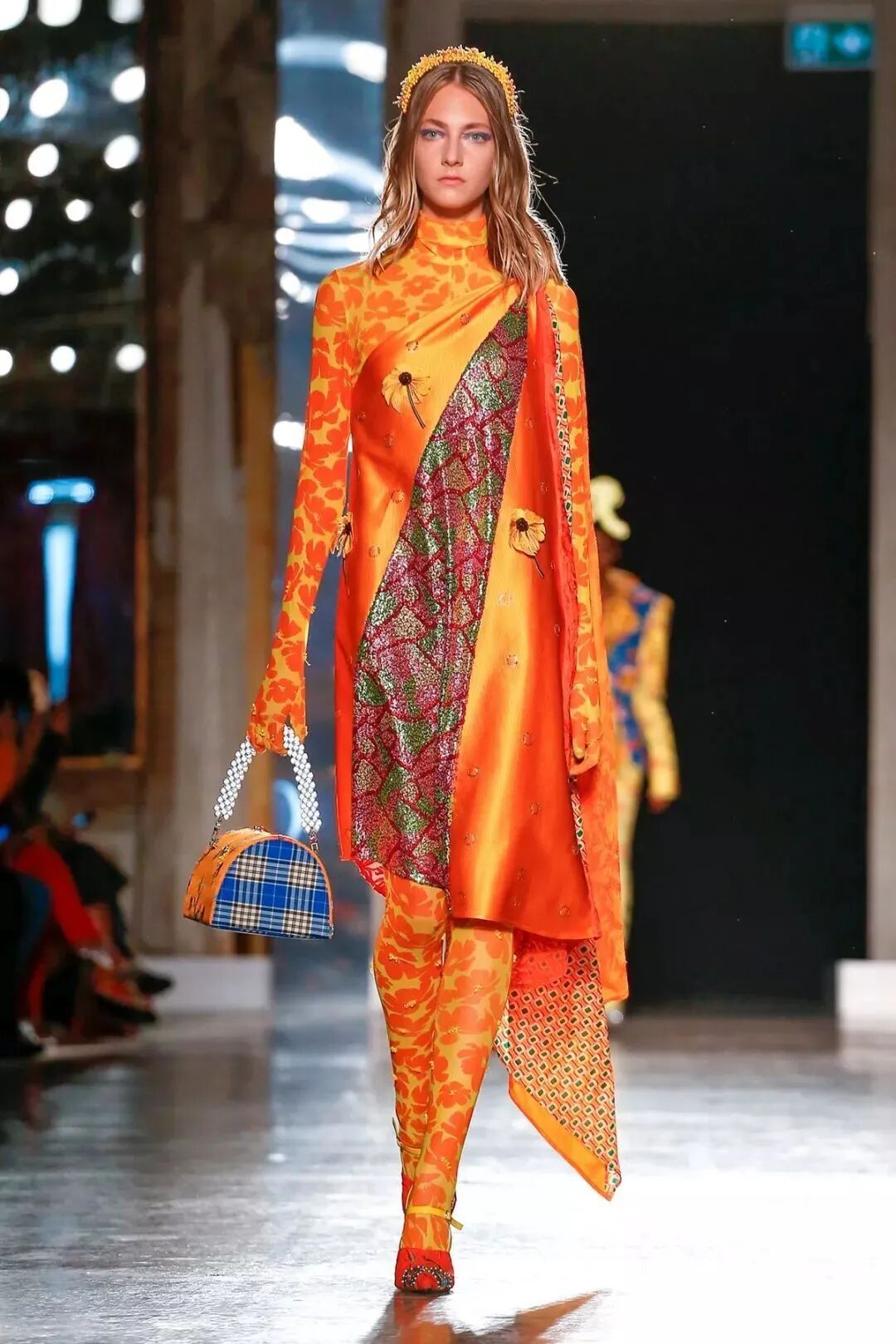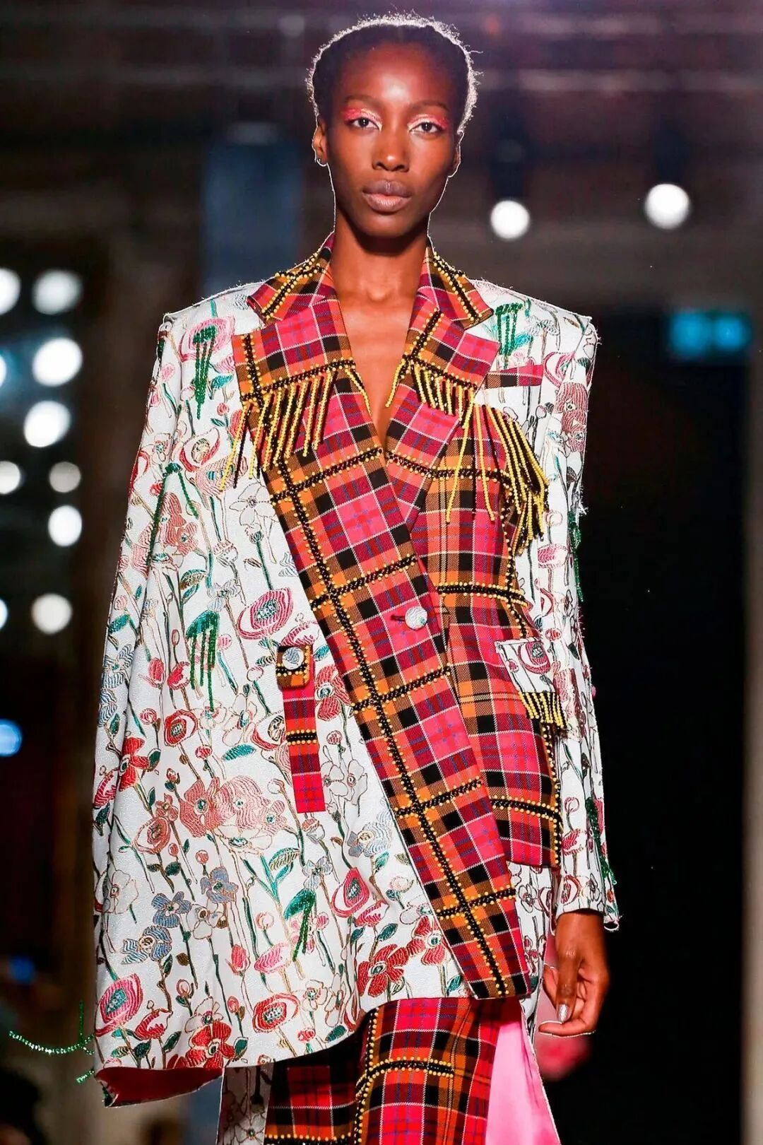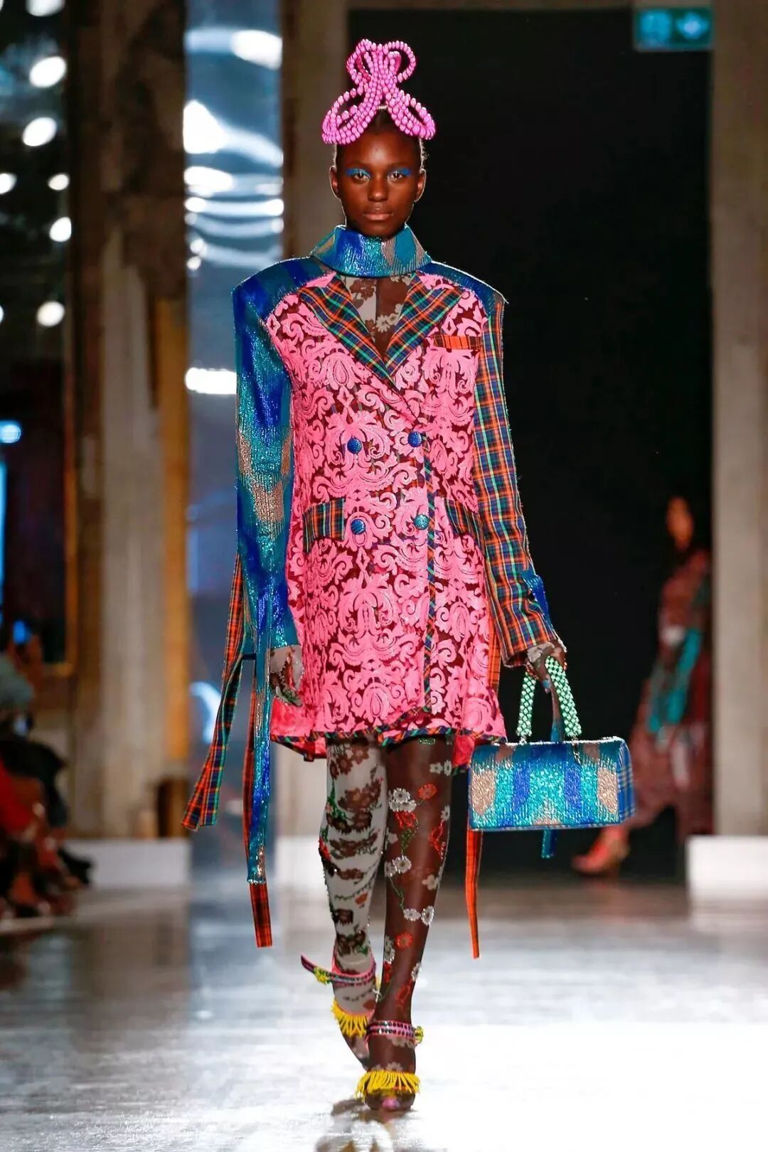 你能看到SHUTING QIU对面料设计的部分十分的用心,她将来自印度纯粹的、原始的大色块和手工刺绣钉珠工艺结合到英伦风格之中。