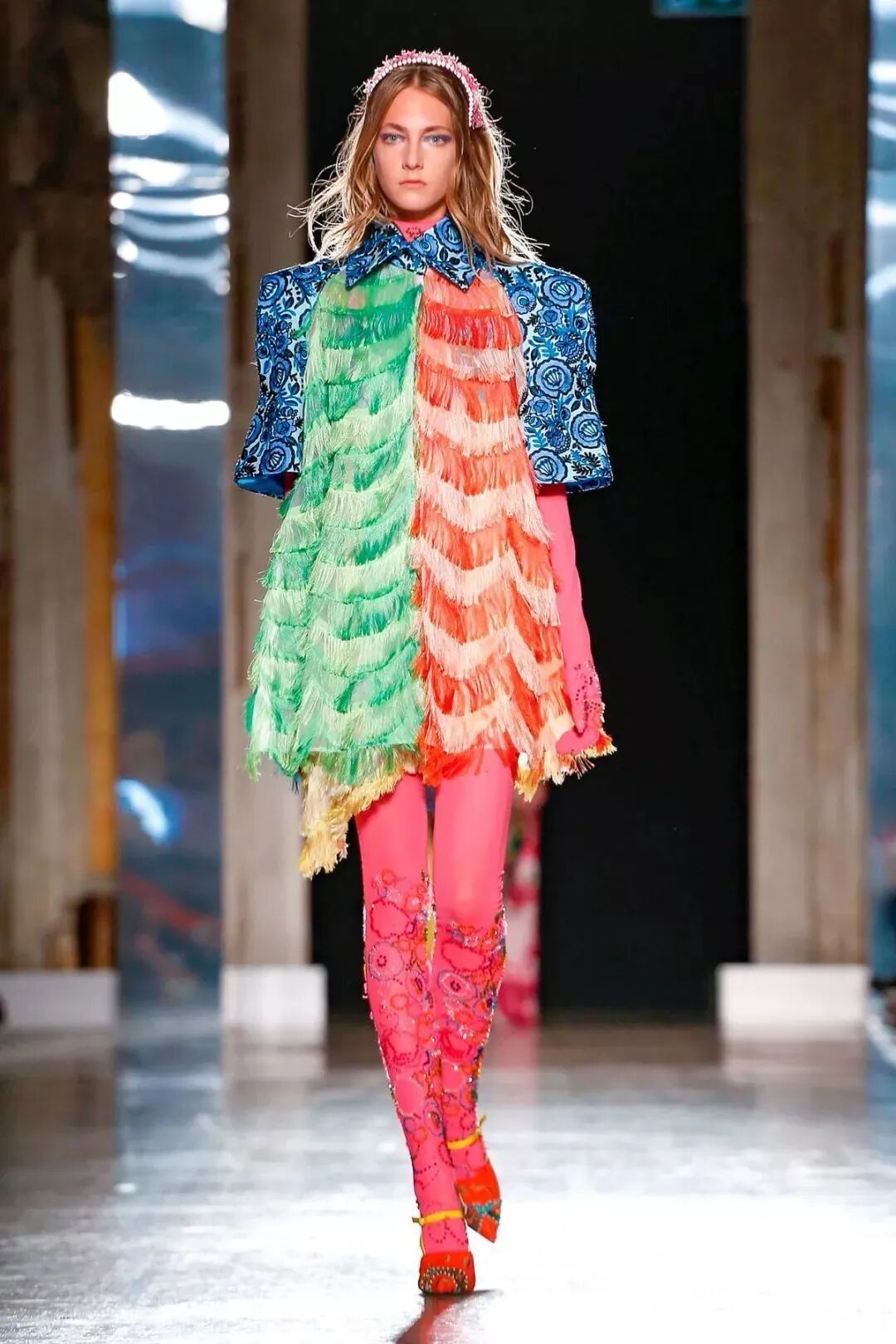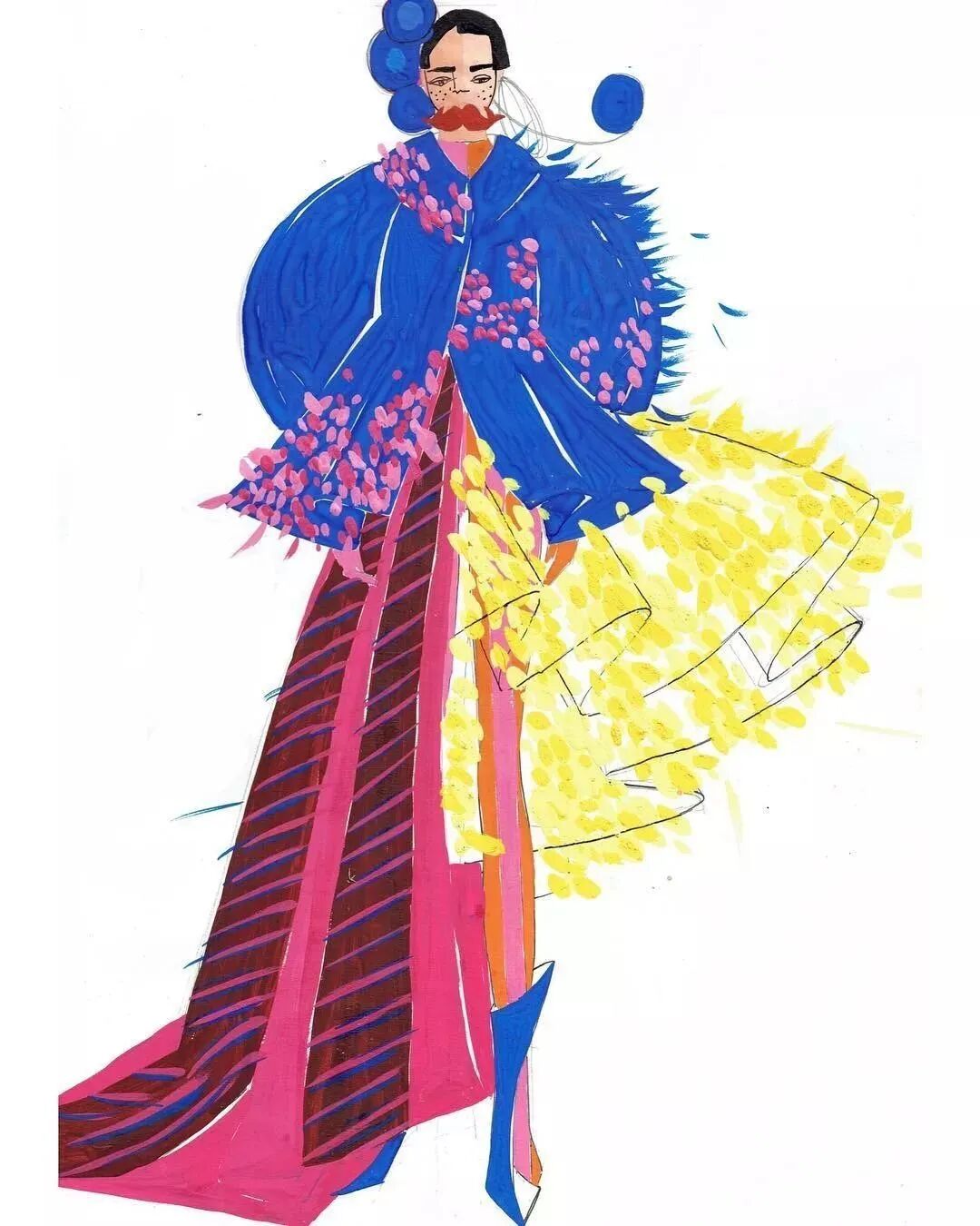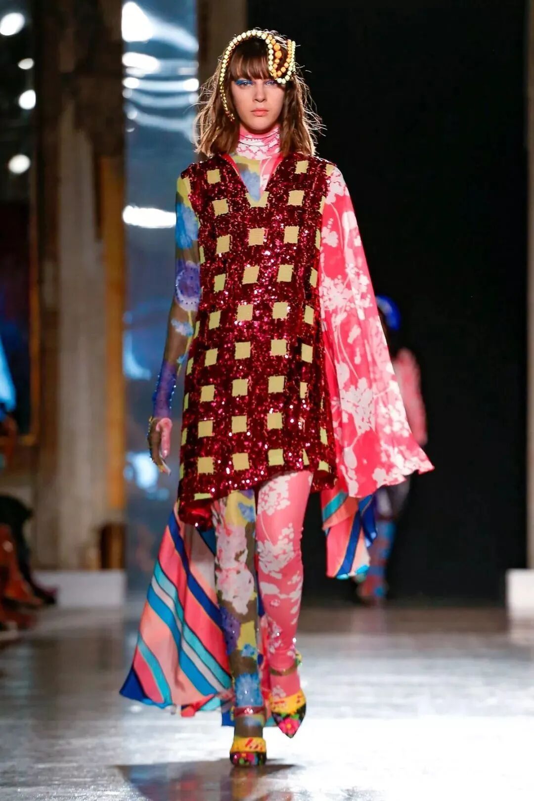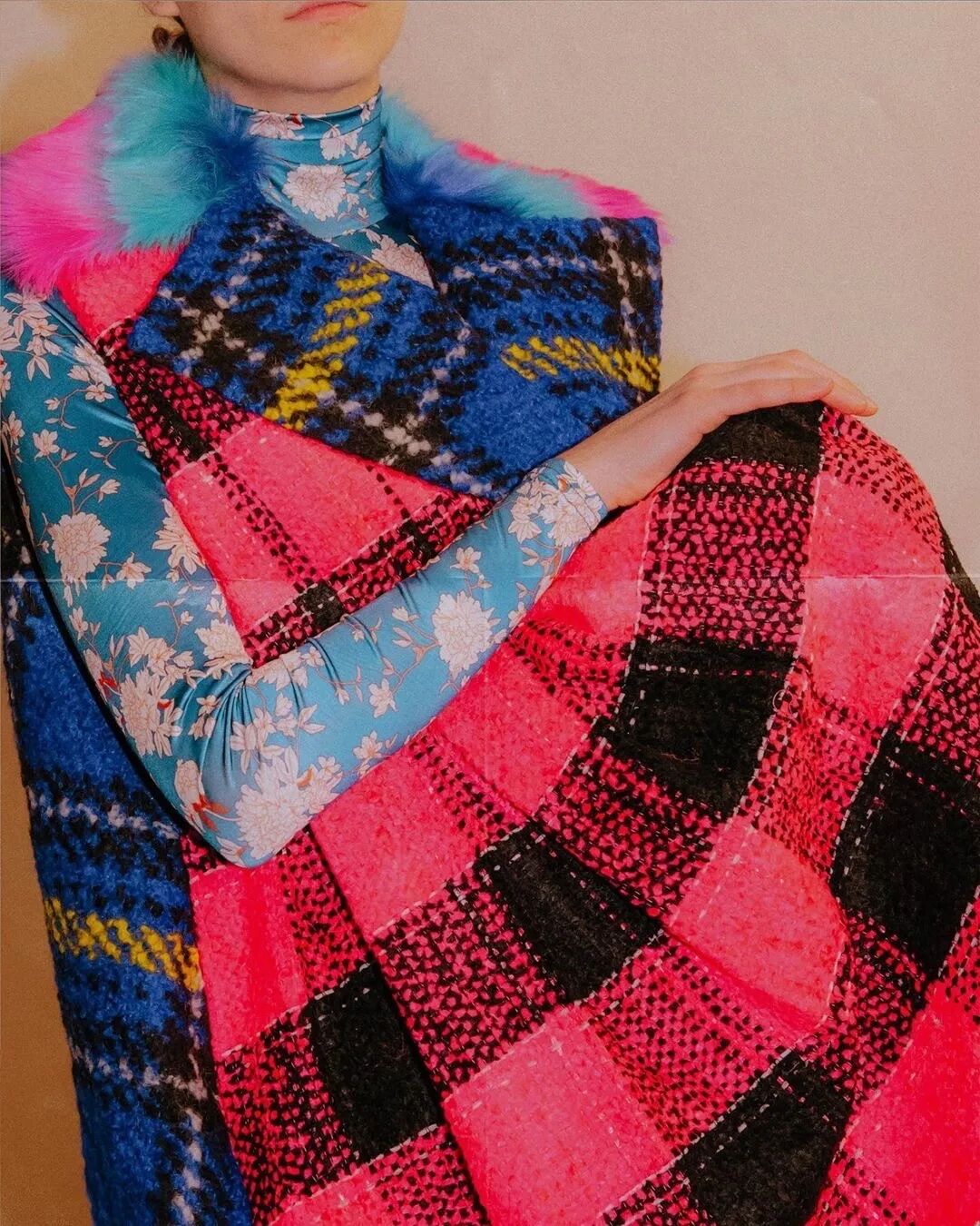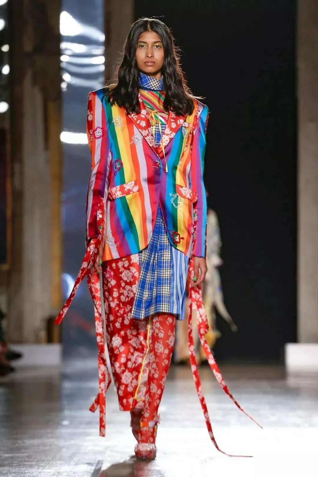 你能看到SHUTING QIU对面料设计的部分十分的用心,她将来自印度纯粹的、原始的大色块和手工刺绣钉珠工艺结合到英伦风格之中。