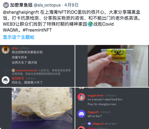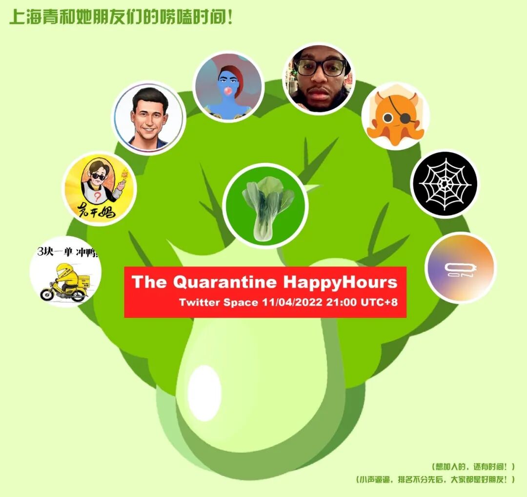 而在本月 11 日,上海青NFT还邀请了DAO Gan Ma(老干妈NFT)、送外卖NFT,共同在Twitter Space开了一场问答讨论活动,除了对自己的NFT项目进行介绍和宣传外,也分享了许多与上海疫情生活有关的故事、现象,并探讨了可能的解决方案与互助方式。