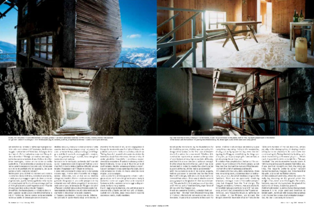 凭借他的高山项目一贯的平静,莫利诺为他的设计的三层楼加入了一个混凝土盒子,一个从上面降低的铝制屋顶。还有一条通往冰川的秘密通道:著名的岩石隧道。它建于1956年,一直被滑雪者当做滑下费尔根雪道体验的一部分使用到1993年。这是一座令人敬畏的建筑,一种征服恐惧的设计——这种恐惧影响了莫利诺的整个生活,但并没有真正影响他的决定,恐惧克服了他对理性的追求。