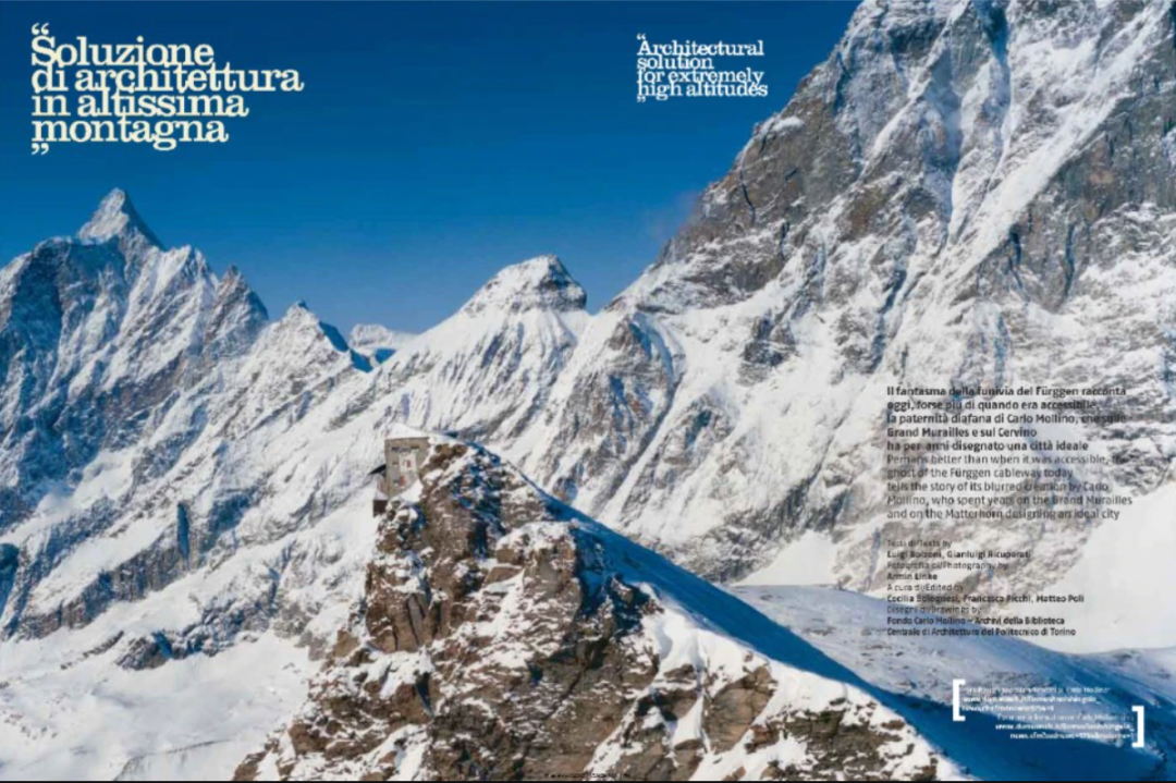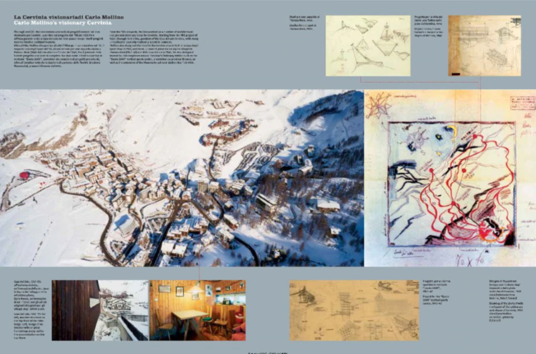 莫利诺从30年代起就为意大利西北部奥斯塔山谷地区的一个高山度假胜地切尔维尼亚设计了许多建筑设计,提供了富有远见的想法。从1939年的PRG项目开始,到1954年太阳之家的落成典礼,中间还有许多未实现或部分实现的项目。