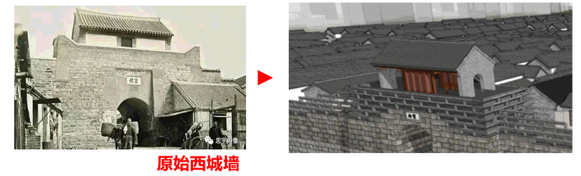 以研究的城墙数据为依据,我们确定了新建城墙的坡度为1:10,保留传统城墙的坡度比例及各种文献中记载的城墙和城门楼的尺寸。