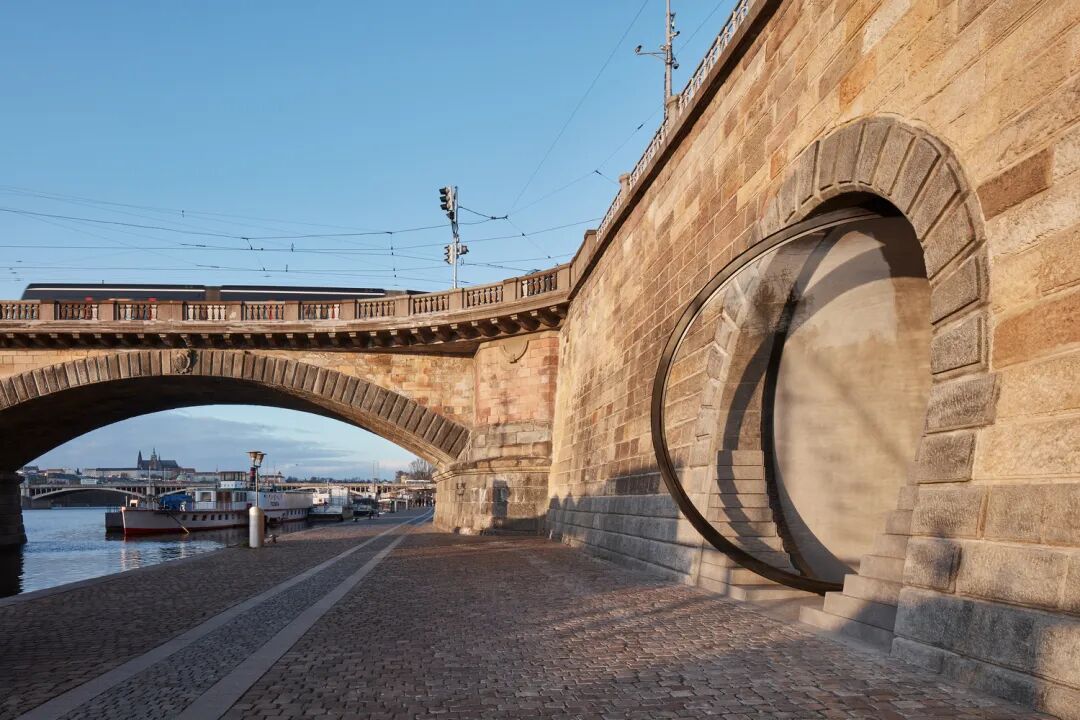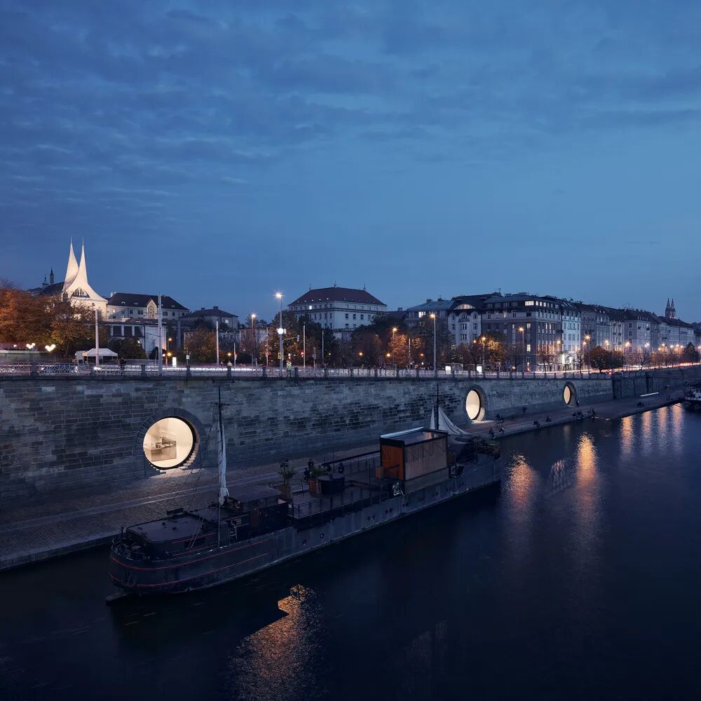 伏尔塔瓦尔河 (Vltava)在脚边缓慢流淌,河岸上的建筑物比肩而立,庄严而肃穆。设计师既不想打破这种神圣感,又不想让整个城市空间死气沉沉,于是打起了桥洞的主意。他希望能在整个河岸上,嵌入一些功能性空间,使得人、河流以及公共空间能产生互动于连结,而不是一个个独立的个体,于是对桥下的20个球形空间进行改造复兴,于是就有了河岸边的咖啡厅、工作室、俱乐部、工作坊、画廊、图书馆分馆、邻里聚会空间和公共卫生间。