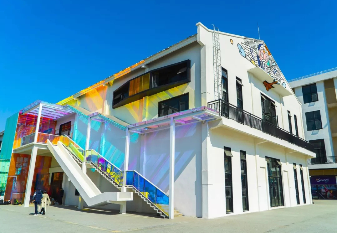 园区以黄、白、橙三色为主,北欧式的简约设计、纯白的墙体、红白相间的窗框、黄色的楼体线条、大片色彩浓烈的涂鸦,可爱有趣,被称为“文艺清新的糖果创意园”。