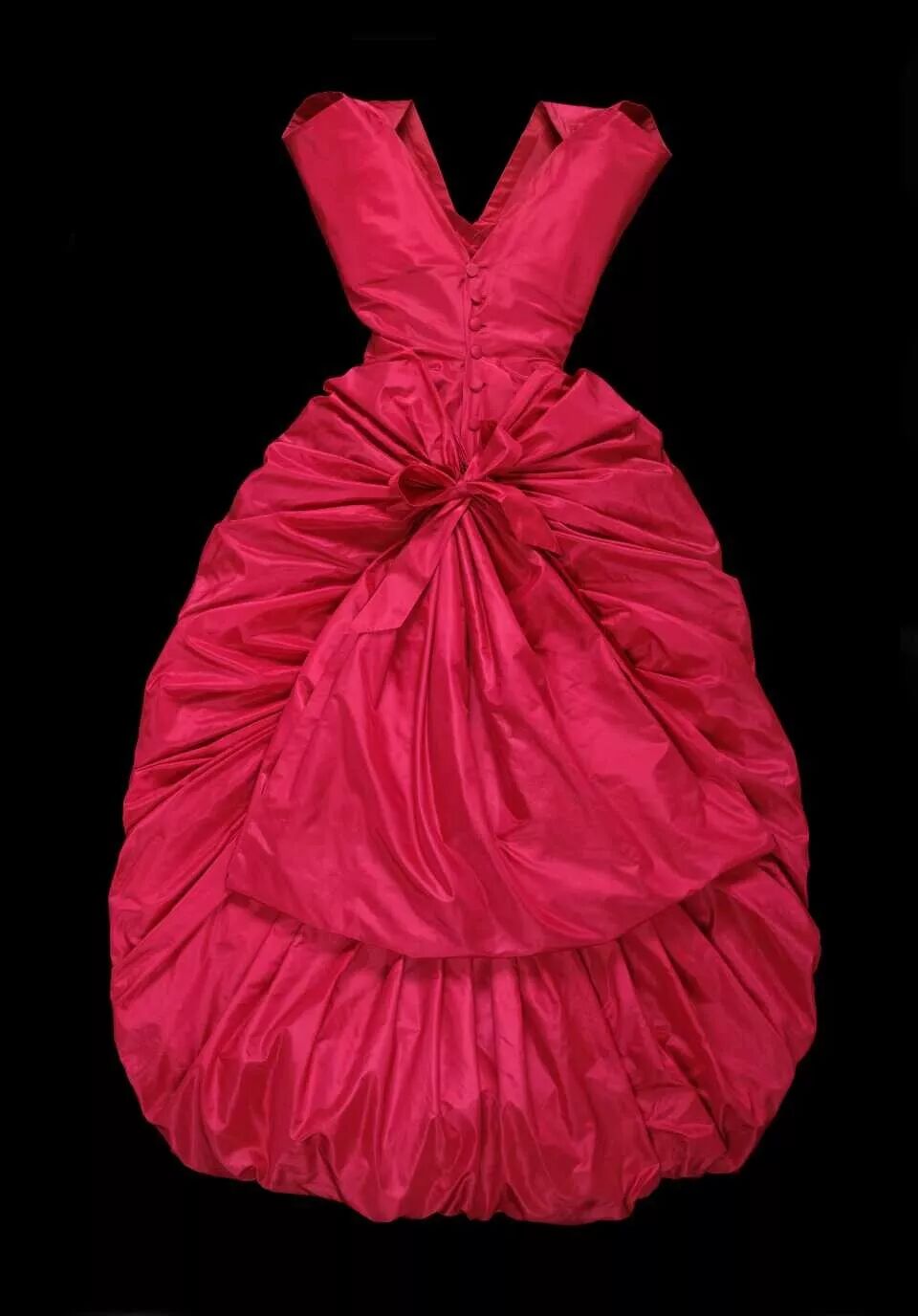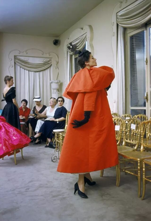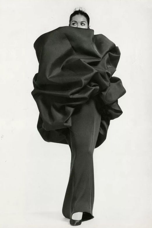1954,Balenciaga先生设计制作的塔夫绸晚礼服,塔夫绸犹如烧焦的纸一样薄,塑造成裙装。穿着的模特看上去像云朵在行走。