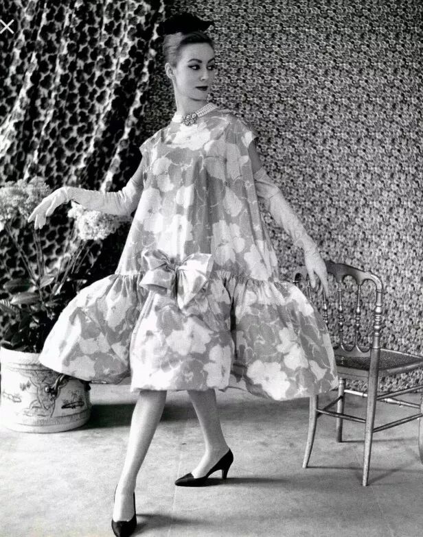 上面这件被称为"郁金香"的裙装——远离身体,干净利落有如建筑造型一般的廓形,找不到侧面接缝,貌似宽松无结构的极简表象,便是带有鲜明Balenciaga风格的代表作。